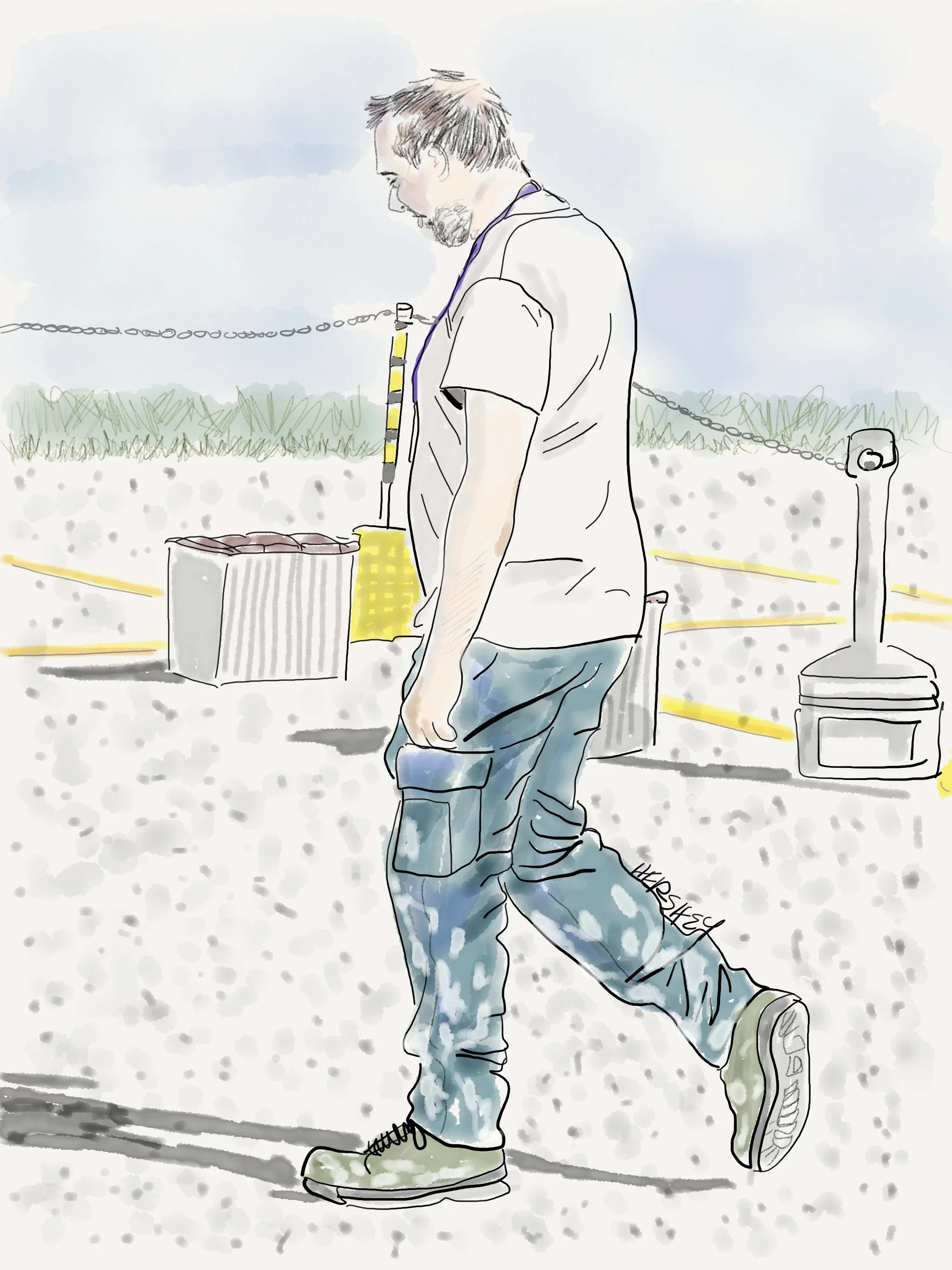 We met Dave in the town of Gaspe at the tip of the Gaspe Peninsula. He was at the end of an overnight shift at LM Wind Power Canada, a leading manufacturer of wind turbine blades in North America. Dave wearily explained that LM has produced over 10,000 blades and currently produces the largest wind turbine blades in the world, measuring 107 meters. These blades are sold in both European and American markets. We asked Dave if we could go inside the factory to see the blades being constructed. “Oh no,” he said, “that’s confidential. I can’t even let my family see inside. Go around the back, and you can see them before they are shipped to Boston for an offshore project.” We were excited by the opportunity and praised Dave for contributing to renewable energy. “Well, that’s all very nice.” he said, “But to me, it’s just a job!” He slowly walked toward his car to go home to sleep. Drawing by Jenny Hershey. Follow her on Instagram @deeofo.