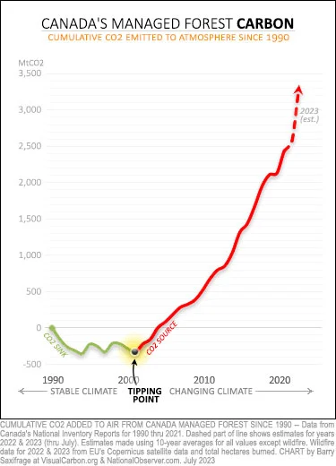 The falling green line on the chart above shows that in the early 1990s, the forest was a valuable carbon sink, helping to slow global warming. Back then, new forest growth absorbed more CO2 from the air than was emitted by logging, wildfire and decay. That all changed after 2001, the tipping point year for Canada's managed forest. As the rising red line on the chart shows, since that year, the forest has emitted more CO2 than it has absorbed. A lot more. Logging, wildfires, insects and the many forms of decay are now turning trees into CO2 faster than the forest can grow back. Chart data provided in Canada's official national greenhouse gas inventory, plus recent wildfire data from the European Union's Earth Observation Program. Report from the National Observer.