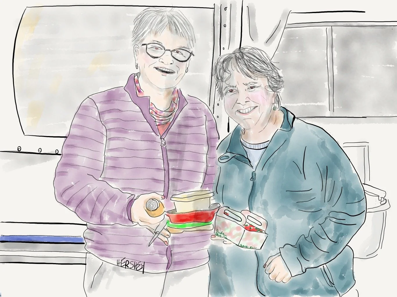 We met Helene and Paule from Sherbrooke, Quebec, at a rest stop near Saint Maxime du-Mont-Louis. They were on their way to a camping trip to Forillon National Park at the tip of the Gaspe Peninsula. Almost by accident, we found ourselves discussing family values, and Helene and Paule shared their story of love and building a family. They met over 30 years ago. Helene is a retired audiologist, and Paule still works as an occupational therapist for ALS patients. They both came out to their friends and family years ago and eventually adopted two children. However, at the time, they were not legally able to adopt together as a same-sex couple, so they each legally adopted one child, although they continued to live as a family of four. Helene explained, “It took a few more years for us to come out to our larger social and professional communities.” However, those communities gradually came to accept them, and they have been well-integrated into the Sherbrooke community for years. Along the way, they’ve seen a lot of progress toward tolerance. However, they are now concerned by the anti-LGBTQ sentiment reappearing in Canadian political and cultural life, much like the United States. Drawing by Jenny Hershey. Follow her on Instagram @deeofo.