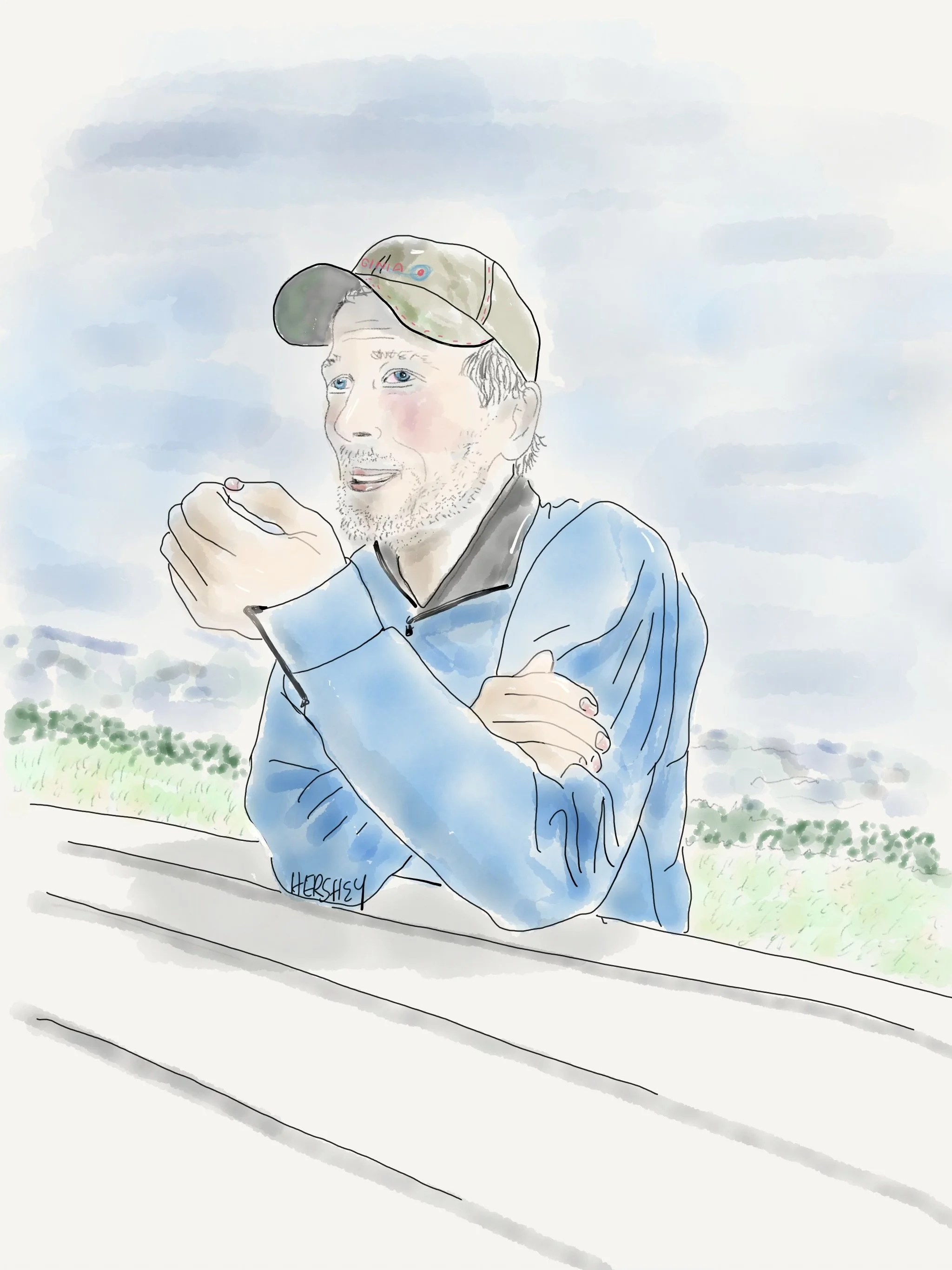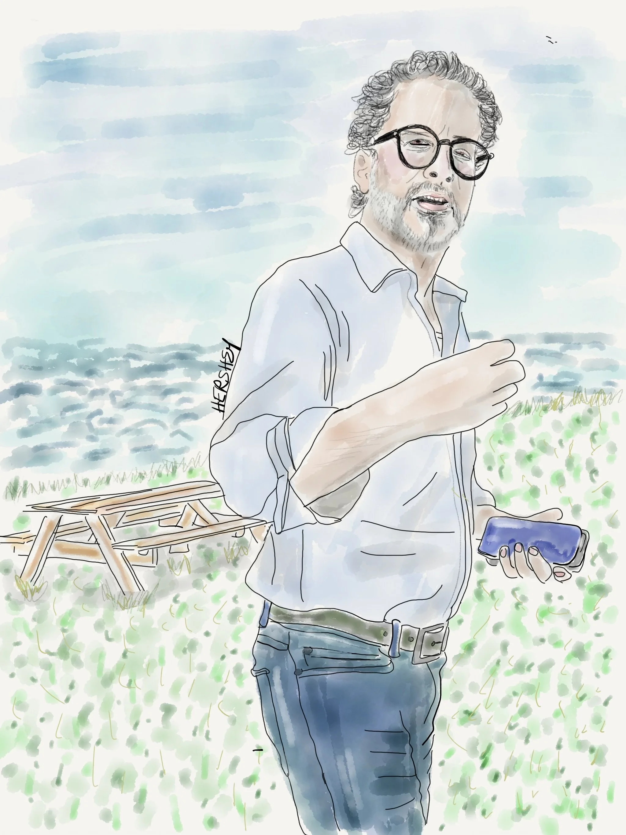 James owns the L’Etoile du Nord Motel on Pointe-a-la Fregate on the Gaspé Bay Peninsula. He purchased his motel/restaurant before the COVID pandemic but decided to run his Montreal-based cybersecurity consulting business remotely once it hit. James runs a tight ship as a motel and restaurant owner while simultaneously running his cybersecurity business. He greets his motel guests for breakfast, engages in warm morning chatter, and then promptly hops on Zoom calls with his cybersecurity staff in Montreal. James shared some of his dreams while showing us around his property. He is very proud of a late 19th-century ice house that he moved inland to protect from storm surges. As we walked on, he gestured to some empty beehives, telling us the bees didn’t make it through last winter and he’ll try again in the spring. Then James showed us a spot where he hopes to build a lighthouse. In a touching moment, he placed his hand over his heart and confessed his greatest joy is having his two young adult sons working with him this summer. Drawing by Jenny Hershey. Follow her on Instagram @deeofo.