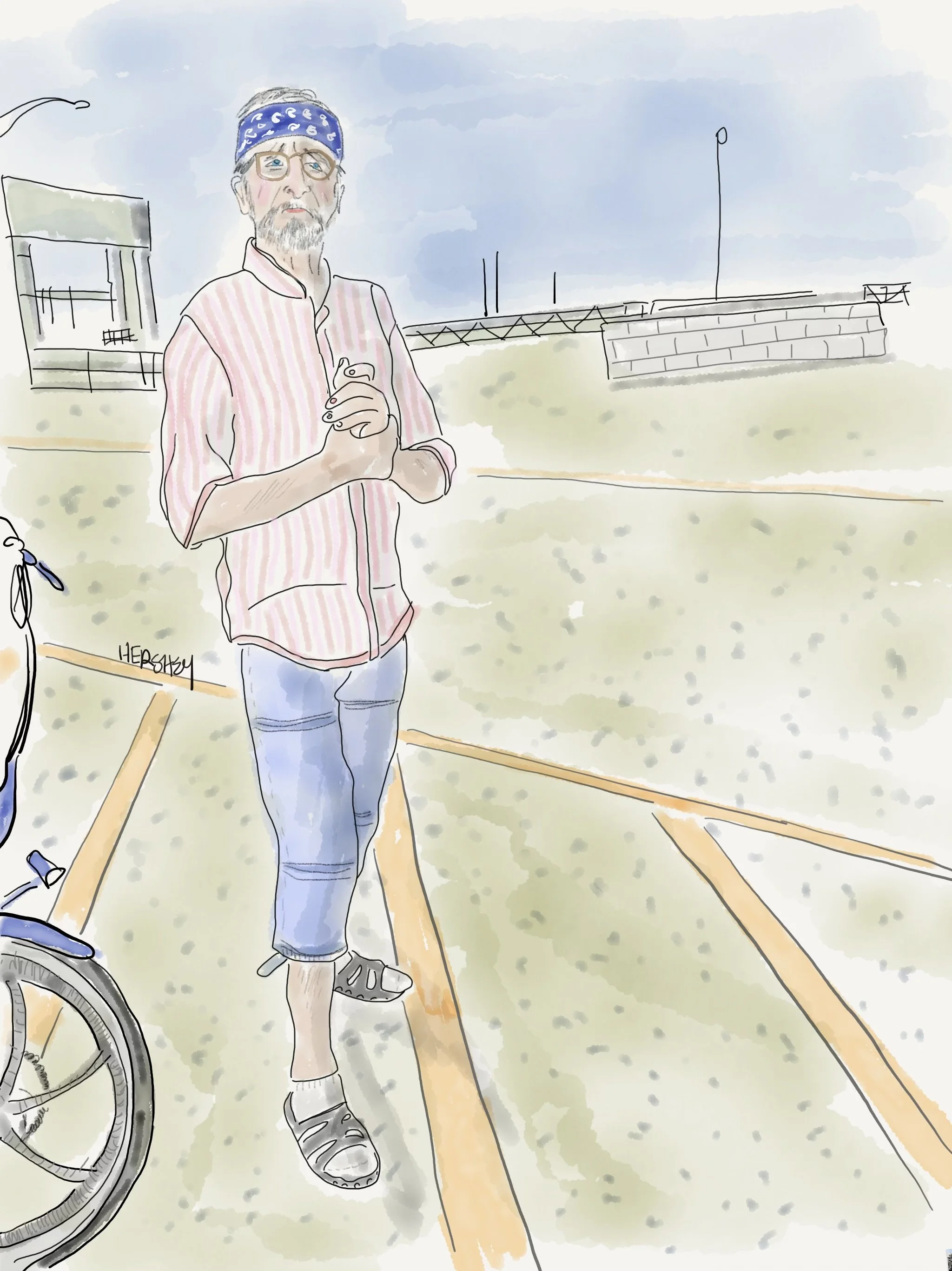 We met Larry at a rest stop in Grande-Valle on our way to the village of Gaspe at the very end of the Gaspe Peninsula. Larry is a strikingly handsome 64-year-old man from Quebec City. He now lives in his van, which he runs on vegetable oil. On the roof was a solar panel. Flashing a charming smile, Larry declined our lunch offer and proudly told us he had caught a striped bass earlier that morning, which he planned on eating momentarily. Although our French is poor and Larry’s English was limited, we talked long enough to realize that Larry is a proponent of the “deep state” resistance common to QAnon followers. We were surprised and almost intrigued by his passion as Larry shared his disbelief in climate change and vaccines, claiming they were creations of a government run by a Cabal pursuing world domination. He claimed there are three kinds of people - globalists (bad guys), technocrats (also bad guys), and nationalists (good guys). He spoke highly of the movie “The Sound Of Freedom” (a true, if not embellished, story about rescuing children from international trafficking that the far right has embraced). Larry explained we must watch it to understand what is really happening. As we were preparing to leave, Jenny asked Larry, “Do you think the earth is flat?” He paused and then answered, “I don’t know.” I am no longer sure what is true and what isn’t.” Drawing by Jenny Hershey. Follow her on Instagram @ deeofo.