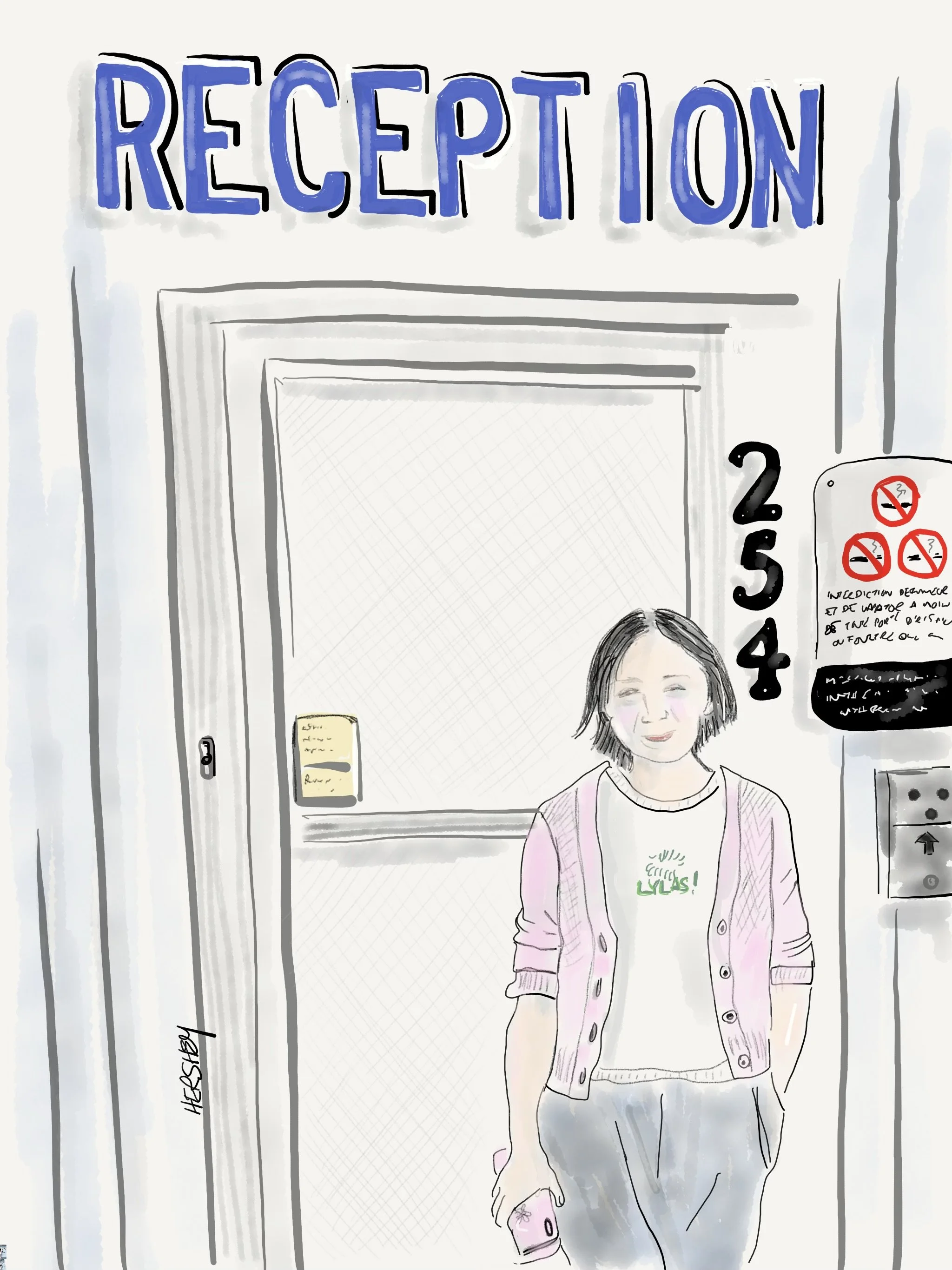 Lily lives between her two motels in Gaspe and Cap-des-Rosiers, Quebec, with her husband, Sparky, and their two young boys, Kevin and Andrew. She and Sparky left their village in China ten years ago after applying to Canadian customs as a skilled worker. Jenny asked her, “What’s your skill?” Lily answered she had been a marketing professor at a college in China. She and Sparky learned French, opened a bodega in Quebec City, and slowly built up their business. One day, a customer came into their store and told them about an opportunity to own a motel in Gaspe at the eastern end of Quebec. Liking what they had heard, they drove hours out to the east end of the Gaspe Peninsula. The rest is history. Lily’s quiet demeanor didn’t fool Jenny. She could see that Lily knew what she was doing. Jenny commended her on being such a good businesswoman. She laughed and said, “Oh no, no, no. I’m a terrible businesswoman.” Drawing by Jenny Hershey. Follow her on Instagram @deeofo.