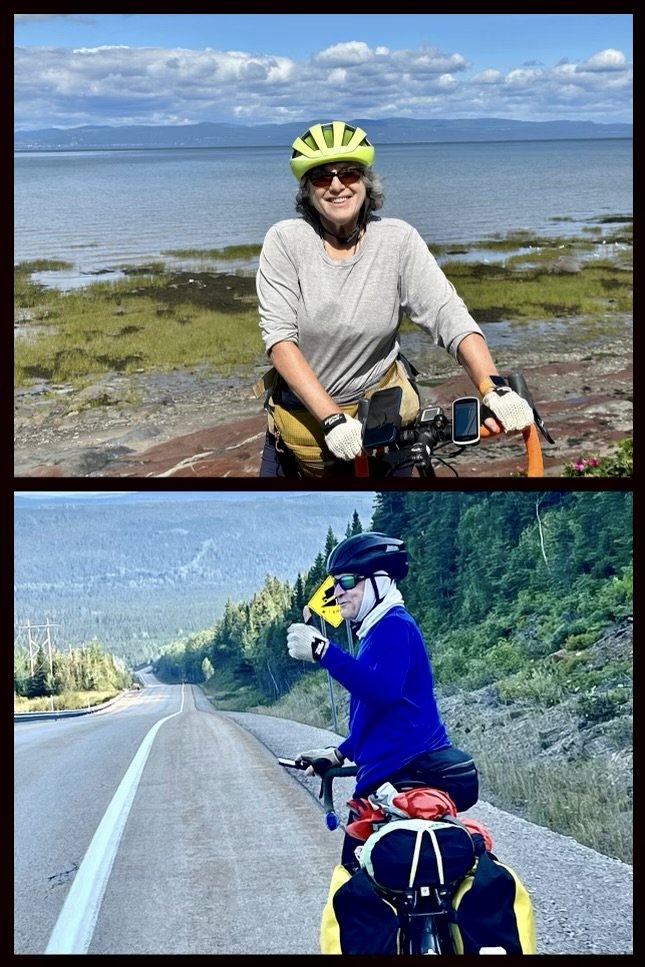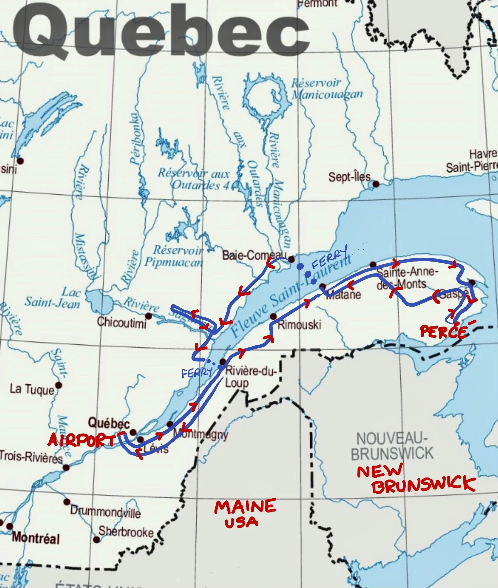We began at Quebec City, riding our bicycles up the north coastline of the Gaspe Peninsula to the town of Gaspe and down to Perce, then across the interior through Murdochville and back to Matane on the north coast of the peninsula, where we ferried to Baie-Comeau, biked down the North Coast of the Saint Lawrence to Tadoussac and up the mighty Saguenay River with its many fjords to St. Rose du Nord, then back to Tadoussac, across the Saguenay River by ferry to Baie St. Catherine, down to Saint Simone, taking yet another ferry to Rivière du Loup and biking back to Quebec City. We rode about 1,350 miles in total. Map constructed by Jenny Hershey. Follow her on Instagram @deeofo.