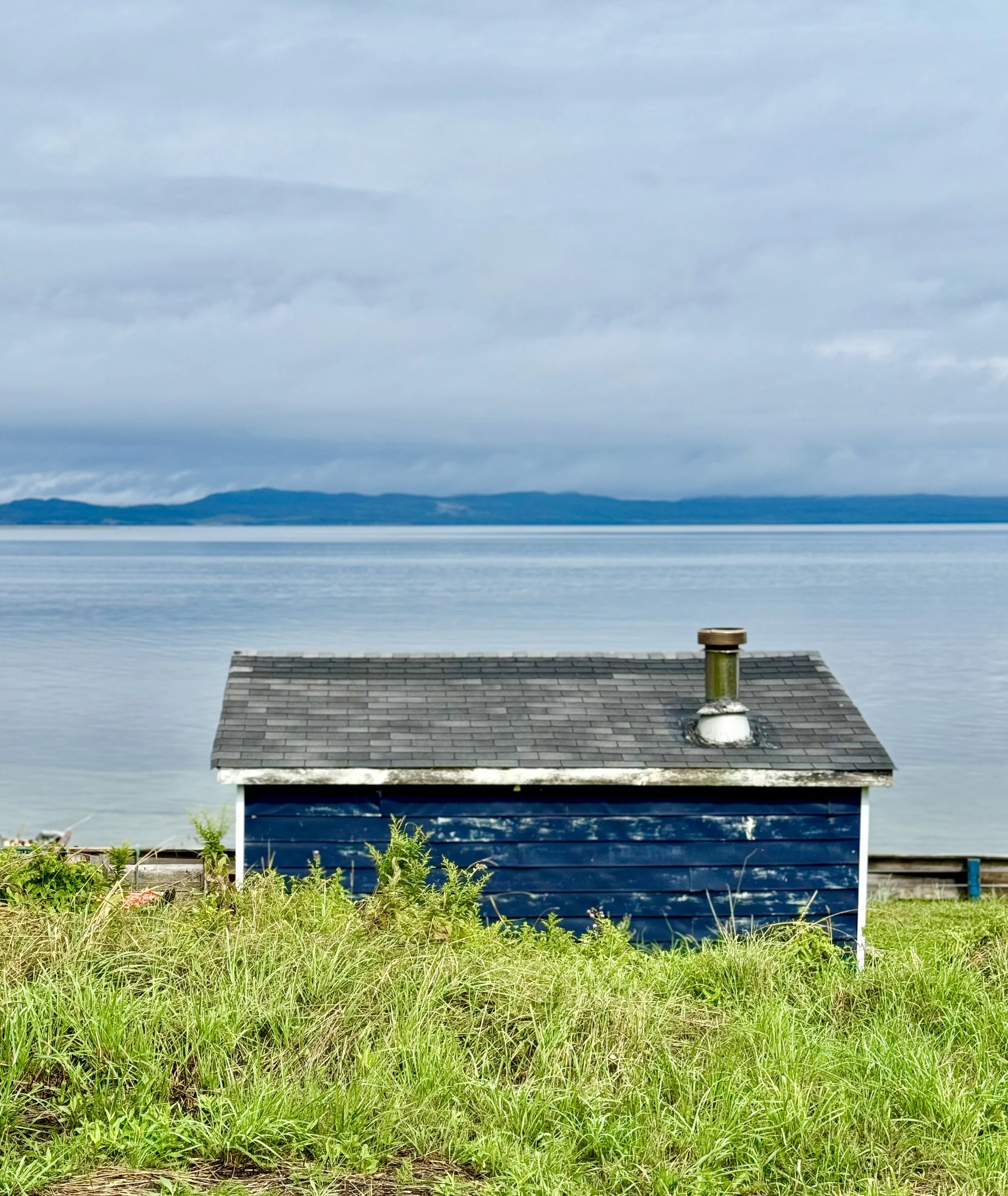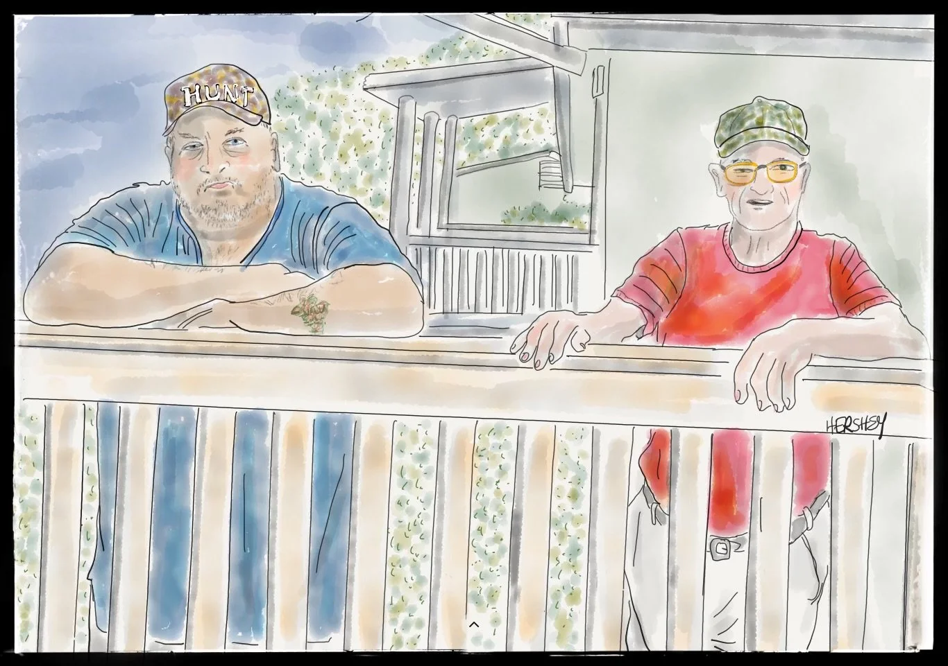 We met Doug and Cyril in the town of St. George. They are best friends and have fishing cabins next to each other, and both work in the limestone mine on the other side of the bay in Stephenville. Doug offered to let us eat lunch on his porch as a respite from Hurricane Ernesto's rain as we all chatted about Newfoundland’s changing weather and politics in the US. Locally born, both men were unequivocal about how the weather has changed since they were kids; there is less and less snow every year, the winters are warmer and shorter, the summers hotter and longer, and there are longer spells of rain and drought than there used to be. Regarding US politics, Doug believed our economy was better under Trump. But Cyril didn’t buy it, and he called Trump a “Hitler.” As opposite as their views were, there was little divisive energy between them. Ironically, Doug is in blue, and Cyril is in red. Drawing by Jenny Hershey. Follow her on Instagram @deeofo.