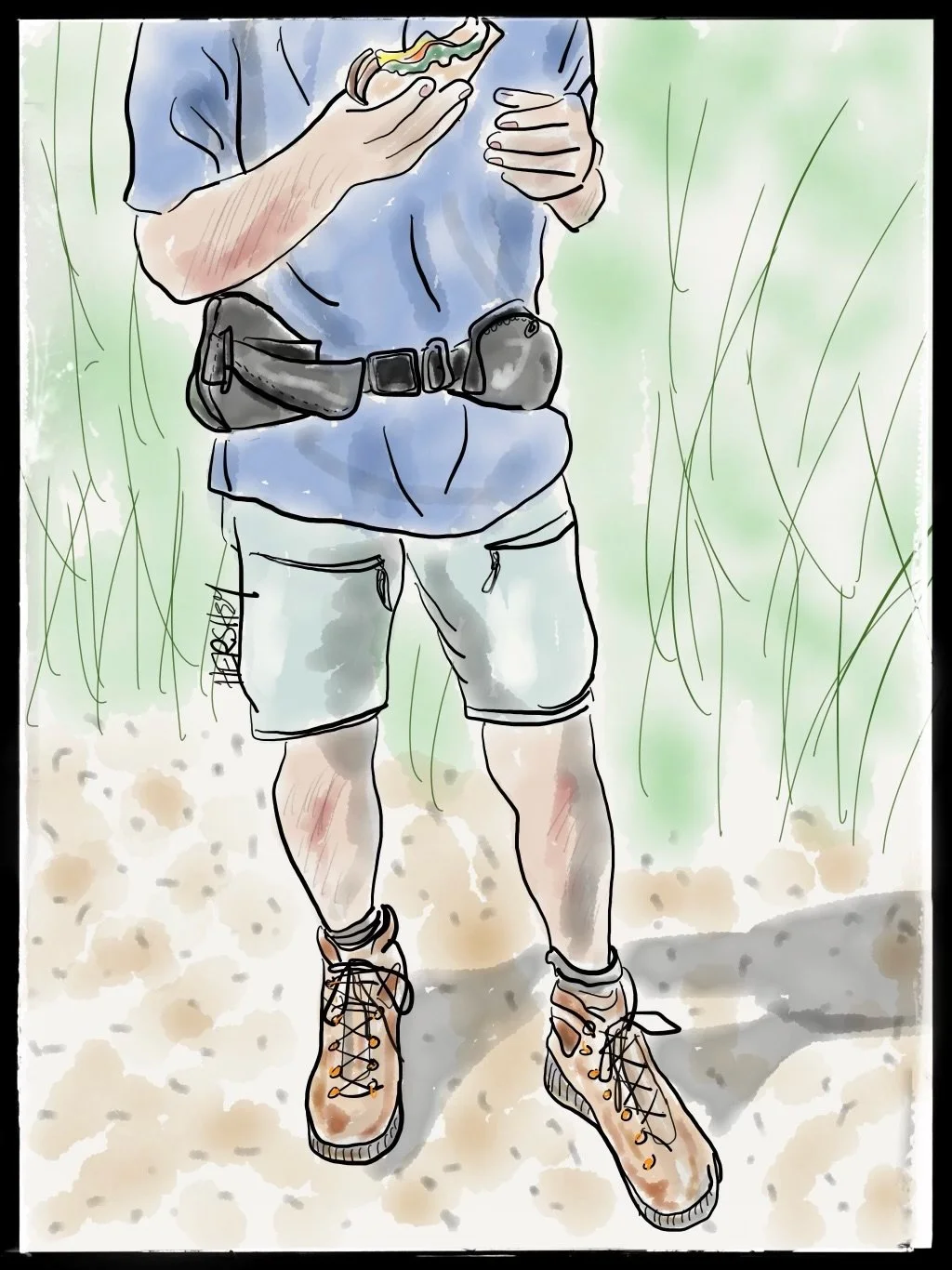 We first met Gary on his 81st day of walking across Canada between Nipigon and Thunder Bay, Ontario, during our May 2024 cycling trip around Lake Superior. At the time, Gary explained he was walking from Vancouver to St John’s, Newfoundland, to raise money for a cause he was passionate about. Jokingly, Jenny said, “Maybe we’ll see you there; we’re going to Newfoundland in September.” On Day 162 of his transcontinental hike, we met him again. We were biking toward Port aux Basque to catch a ferry back to the mainland on Trans-Canada Highway 1, just south of Corner Brook, NL. We had been following Gary on social media, so we thought our paths might cross. We brought him a huge sandwich and fresh fruit, exchanged travel stories, and then went our separate ways. Gary was on his third pair of hiking boots, and Jenny was on her oldest touring bicycle. Drawing by Jenny Hershey. Follow her on Instagram @deeofo.
