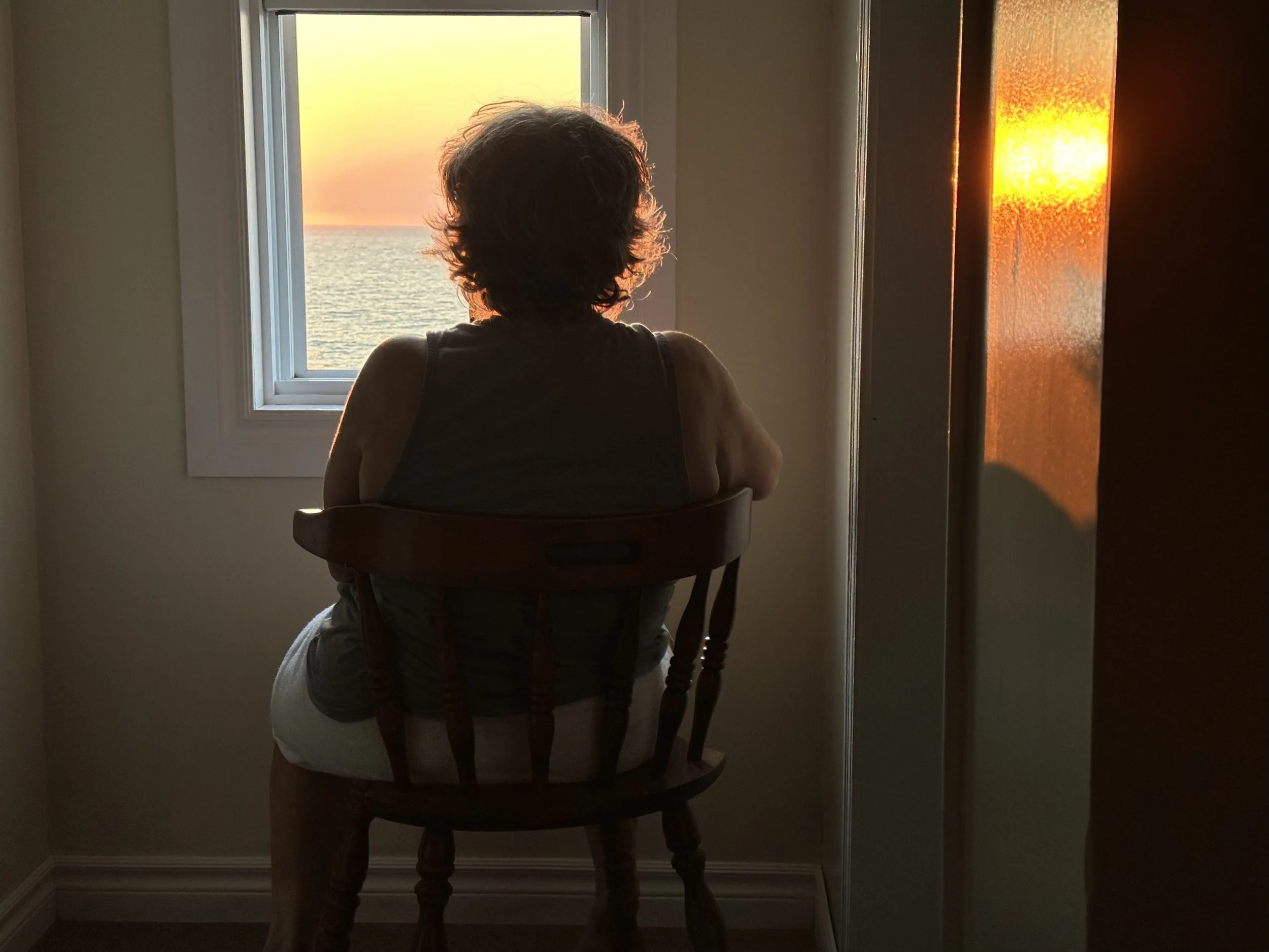 Jenny watches the sunset from a motel window in Daniel’s Harbour.