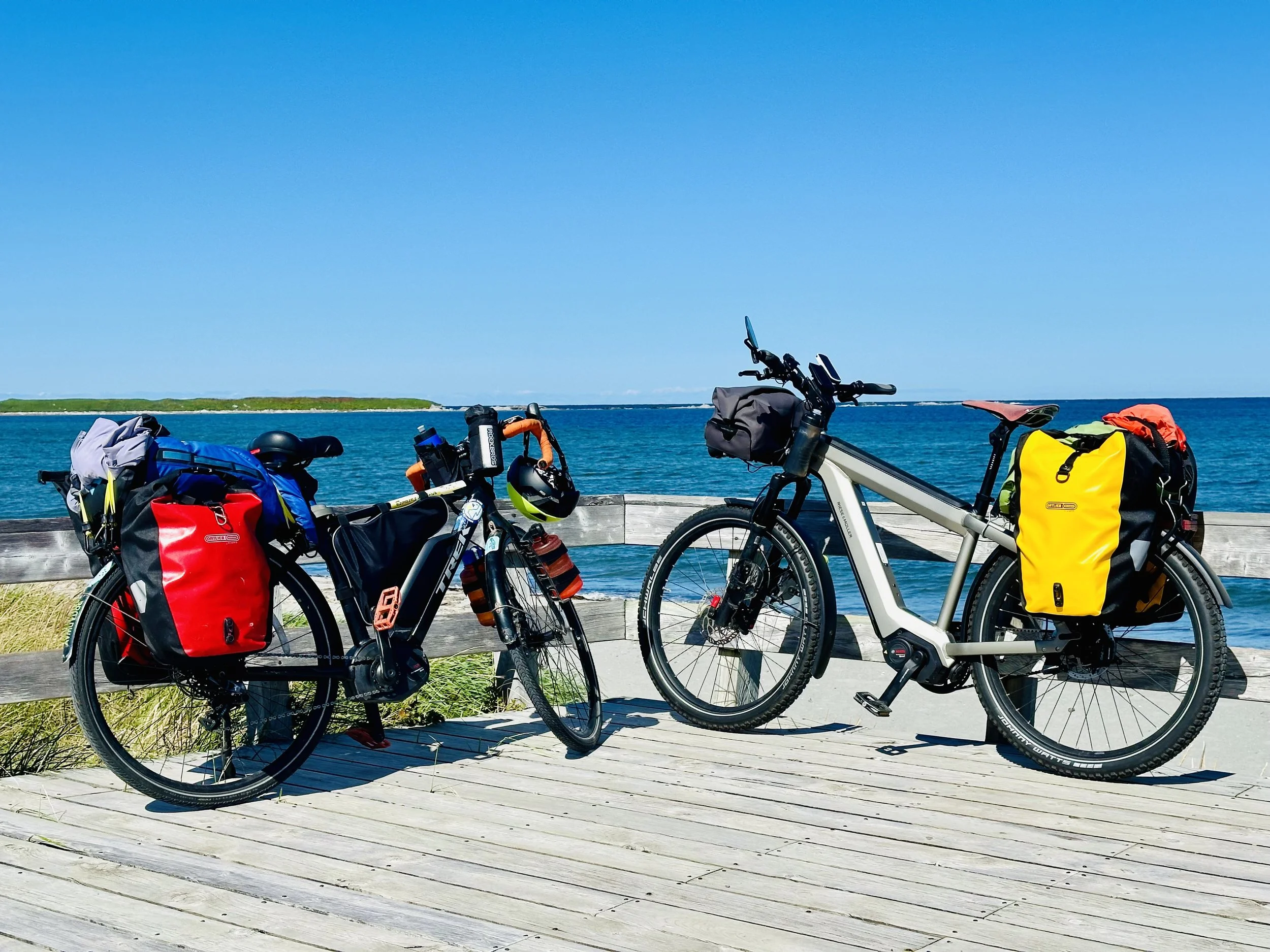 Our bikes on a boardwalk in Gros Morne Park at Shallow Bay near the town of Cow Head.