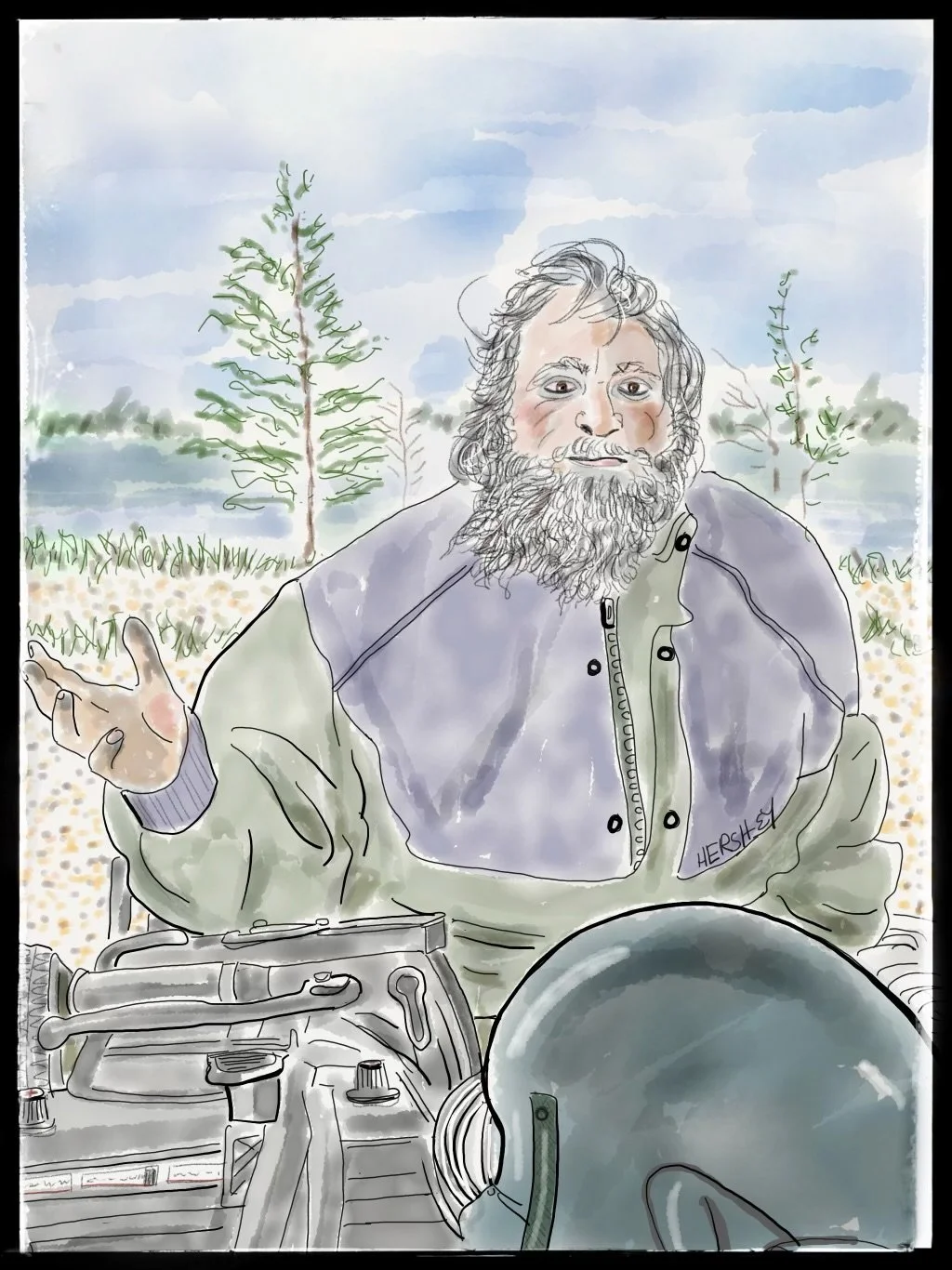 We met Victor in Port Saunders while packing groceries into our bicycle panniers. He pulled up on a weathered ATV, hauling an old wooden trailer full of wood, tools, and gas containers. Very friendly, and with a thick accent of Irish brogue and Canadian twang that we could only half understand, he told us he used to be a fisherman but now he lives on $600 a month he gets from the government. He said it’s not enough to survive and certainly not enough to pay for rent. Victor’s life is hardscrabble, but his one comfort and lifeline is his trusty ATV. He referred to her as “she” and called her his prostitute, “Cause I 'ave ta pay so damn much money ta keep 'er runnin', I do.” Victor then took us by surprise by lecturing us (once he learned we were from the States) about Donald Trump’s ethics. He referred to the Inside Hollywood tapes of Trump talking about what he would do to a woman’s…. well, he wouldn’t even say the word! But then he went on, “‘Ow could a man who was found guilty of sexual assault be elected as President? Dat's absolutely mental, it is!" A man with firm convictions and lots of common sense, we agreed with most everything Victor said (that we could understand). Drawing by Jenny Hershey. Follow her on Instagram @deeofo.
