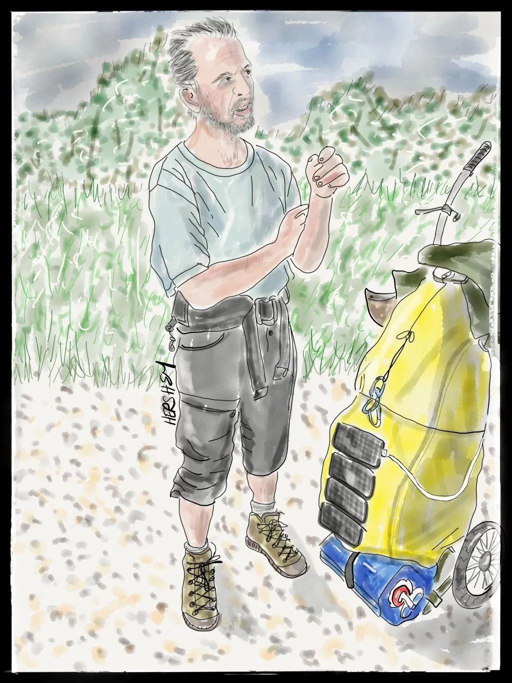 We ran into Gary Grono on highway 17 between Red Rock and Thunder Bay. We were biking south, and he was WALKING north. He was an odd site, walking against the traffic on the Trans-Canada highway (in a new section that is a four-lane freeway), pulling a two-wheeled cart with handles behind him. Gary was in his 81st day of a trek across Canada from Victoria, British Columbia, to St Johns, Newfoundland (almost 5000 miles), and is raising money for the Andean Institute, an organization in Maras, Peru, that “builds community and supports Andean culture”. Gary was affable and talkative, so we shared war stories about our travels. Many of Gary’s stories seemed more intense than ours. Jenny had gotten a tick bite earlier on this trip (not her first time) and took doxycycline immediately as a preventative measure. Gary, on the other hand, told us a harrowing tale about being attacked in the evening as the sun was setting by an army of ticks that got into his tent and infiltrated his clothing and sleeping bag. Several weeks later after discovering a tick that had made himself at home, Gary found an urgent care clinic and started a strong regimen of antibiotics. We were impressed with Gary’s commitment and resilience. He camps most nights, and only occasionally stops at a motel to wash his clothes, shower, and sleep in the comfort of a bed. He loved our bicycles and our rigs, calling them a luxury set up. We were amused; our perspective is that we are spartan in what we carry. We learned that Gary had little power left on his phone because he only uses a solar panel mounted on the back of his hiking trailer. Because it had been overcast and rainy for two days, Jenny offered him the temporary use of a portable battery to give his phone a boost. Gary hopes to meet his wife, Wendy, in Newfoundland in September. We had already been thinking about biking in Newfoundland in September so we hope to meet them both in the future. With Jenny’s help, Gary was finally able to charge his phone enough to communicate with his daughters, who manage his Facebook page. You can find him at @Gary Grono.