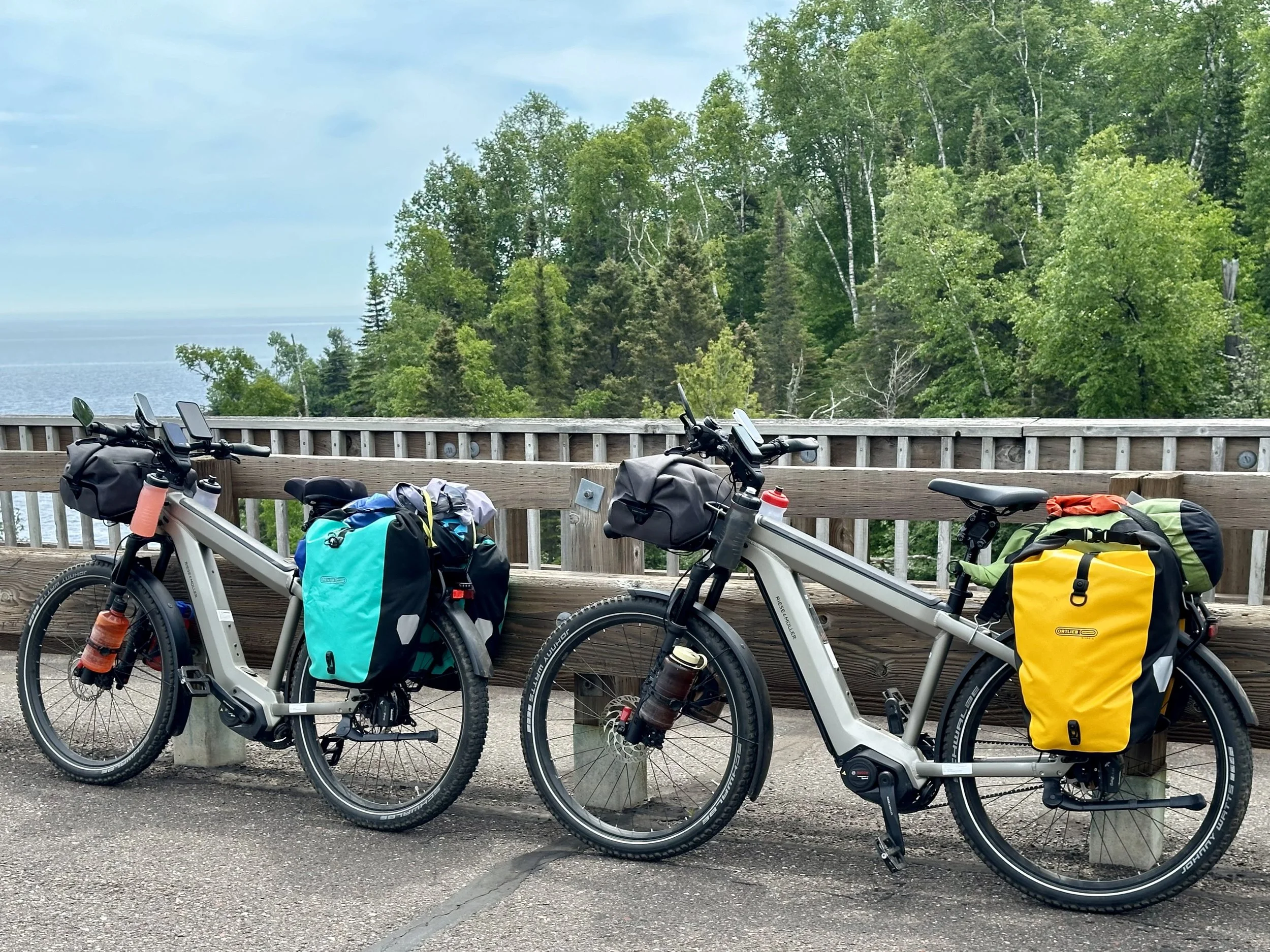 Our new bikes, fully loaded with our gear. We are proud to be pioneering long-distance travel on e-bikes. Since my first two cross-country biking trips were on a traditional road bike, I can speak to the pros and cons of electric pedal-assist bikes. One can get quite a workout (and increase one's range considerably), and one can be pretty lazy for shorter distances. There are e-bikes with throttles that can be ridden without pedaling, but one’s range is limited. Besides, why lose the workout? These bikes were manufactured by the German company Reise and Muller and feature Bosch motors, the major supplier of electric motors to Merdedes Benz. Although somewhat challenging to find in the States, we obtained our Reise and Muller bicycles through a bike store in Brooklyn called Propel Bikes. We like them a lot!