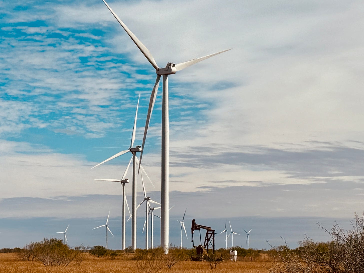 Wind turbines overshadow cattle ranching amidst abandoned oil wells that dot the landscape at Santa Elena, Texas. The land here has been used heavily over the years, and its only purpose is commodification.