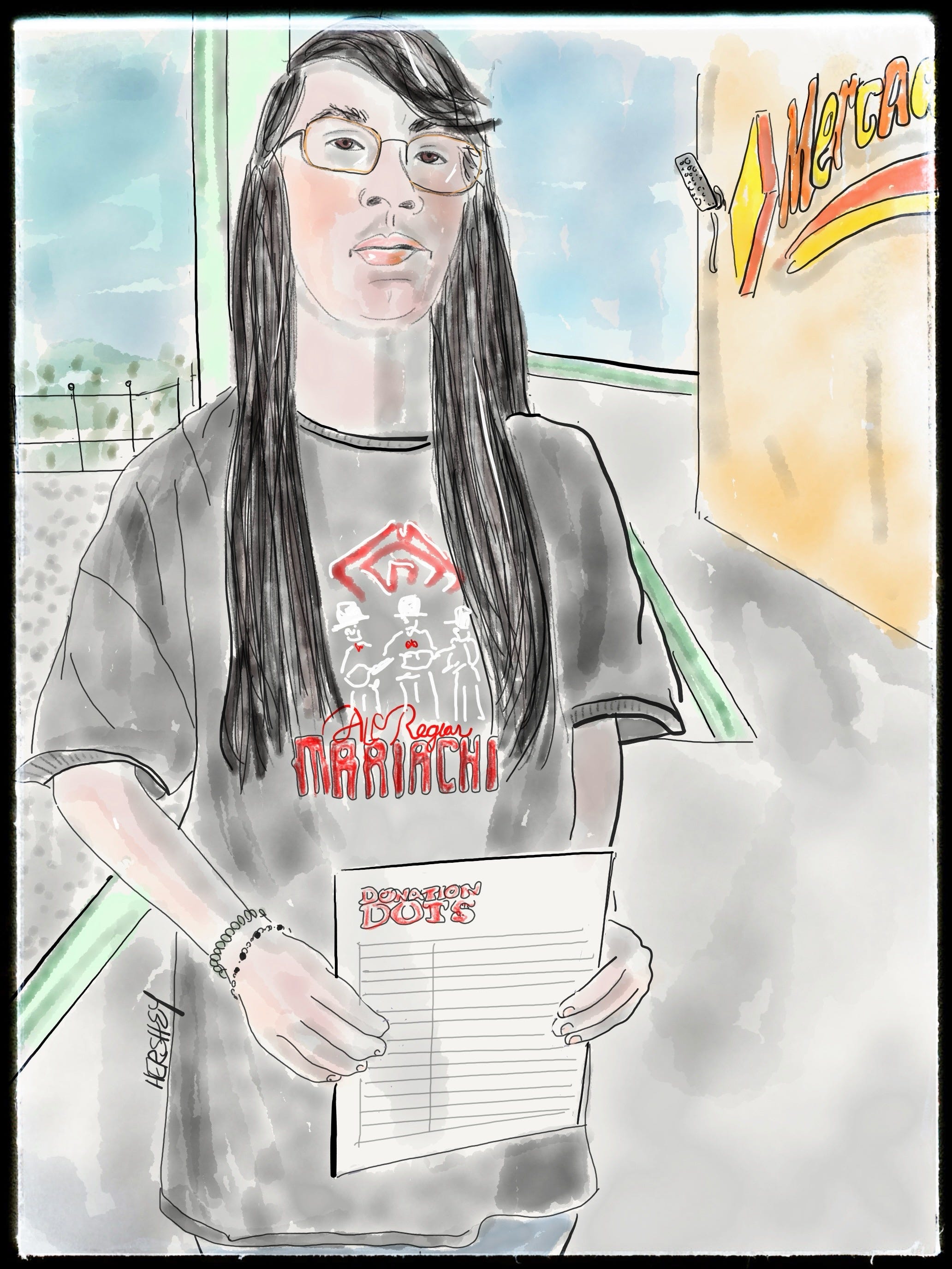 Outside Laredo's Mercado, we met 9th grader Kevin. He was fundraising for his school’s Mariachi band -The Martin High School Los Tigres del Sur- and an upcoming regional competition. Though new to music - he just learned violin through school and can already play a minuet! Kevin was born in Nuevo Laredo, Mexico, and now lives in the United States. His striking, thick black hair flows past his shoulders – a style increasingly embraced by young Mexican men as a way to honor their indigenous roots while challenging traditional notions of masculinity and cultural identity. His choice to wear his hair long speaks to a broader movement among his generation to reconnect with their heritage while defining their own path forward. Between warm smiles to passing shoppers, he shared his dream with us: to become a surgeon. We think he’ll succeed! Drawing by Jenny Hershey. Follow her on Instagram @deeofo.