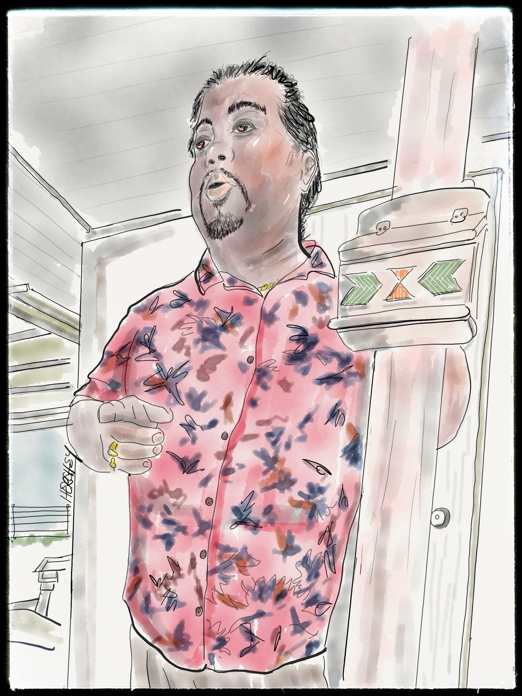 Jacob's family compound in Derby, TX (pop. 50) is a testament to persistence. For seventeen years, a gathering of brothers, a sister, a mother, cousins and an aunt who recently passed has been more than shelter – it has been the family's anchor. Jacob told us about the massive cotton fields that once filled the cleared brush when Texas was a slave state (now replaced by detritus of the oil and gas industry) and shared his own heritage that stretches south across the Rio Grande, where his great-grandfather made the decision to seek a different future in a different land. Jacob's warmth carried an enthusiasm and optimism, as if understanding both the weight of oppression and the courage of migration had taught him something essential about the transformative power of work and enterprise. When Jacob spoke of lifting his family from poverty, his words carried the resonance of two ancestral journeys: those forced across oceans in chains, and those who crossed borders carrying dreams. Jacob's affability was more than mere personality—it was heritage transformed into hope. See more of Jenny Hershey’s drawing on Instagram @deeofo.