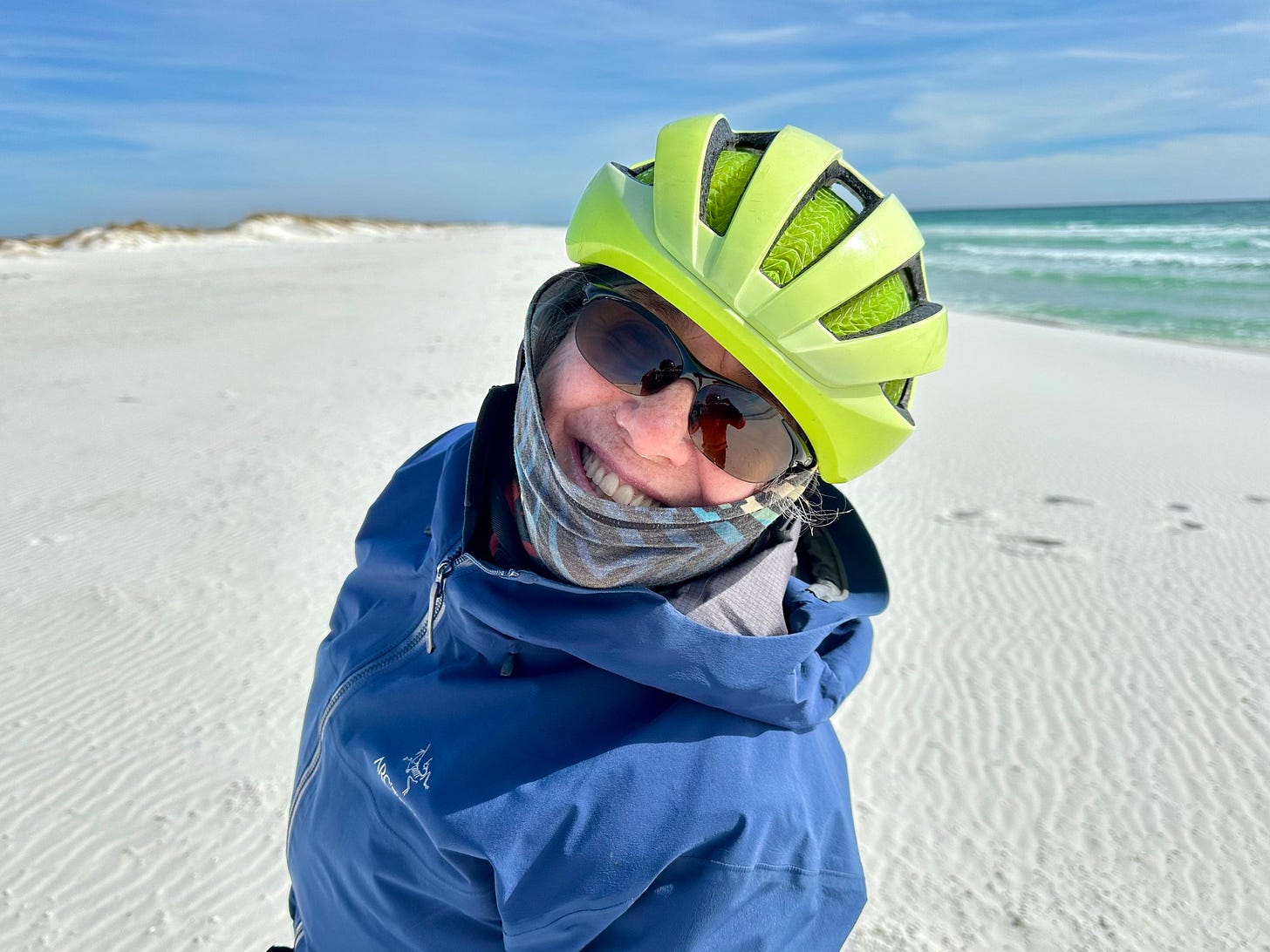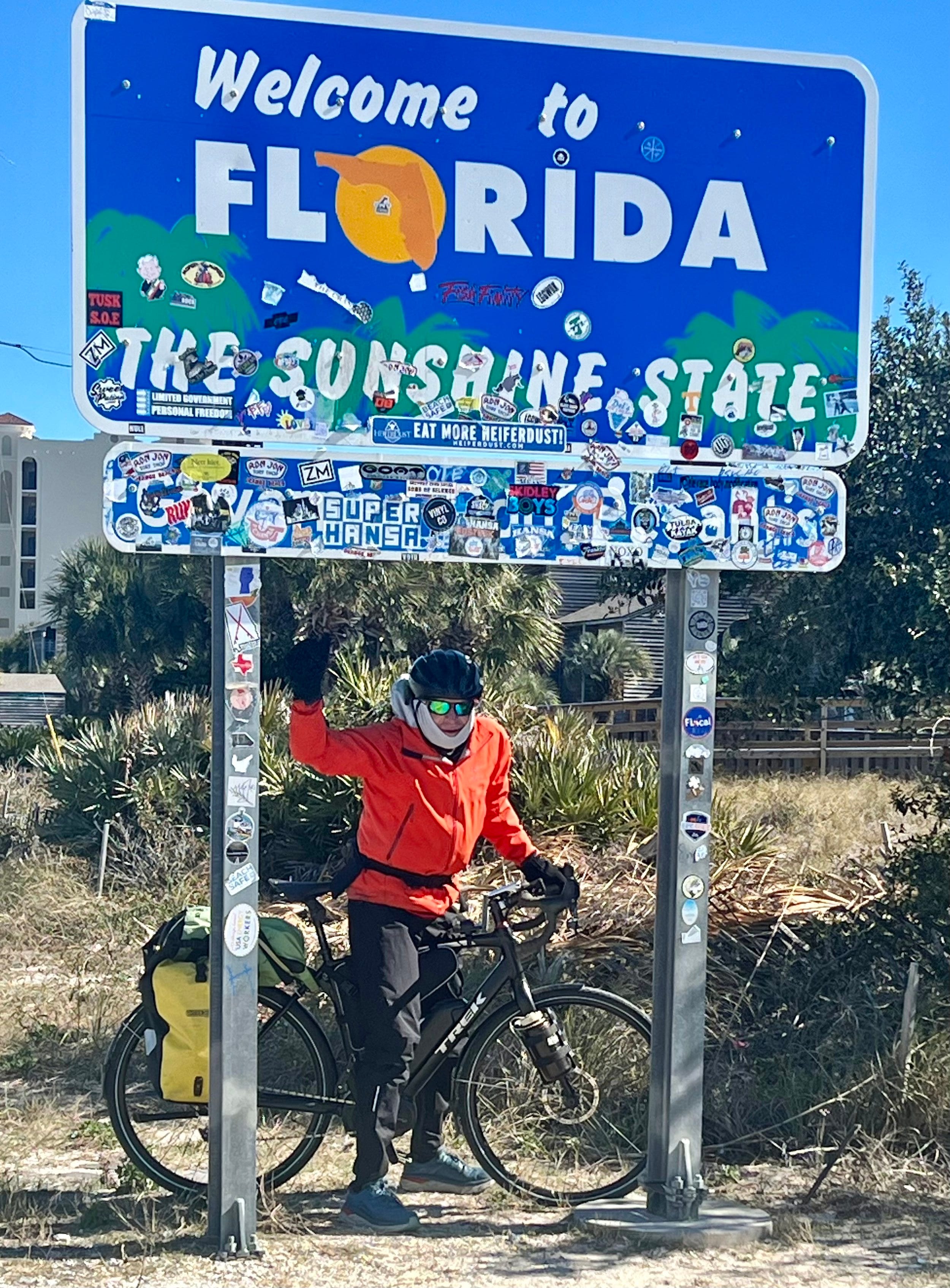 I celebrate at a state line marker between Alabama and Florida on the coast. I am wearing three shirts (one wool), two Gore-tex jackets, and a down vest. My legs and head are similarly layered. Thankfully, the sun was shining. Photo by Jenny Hershey. Follow her on Instagram @deeofo.