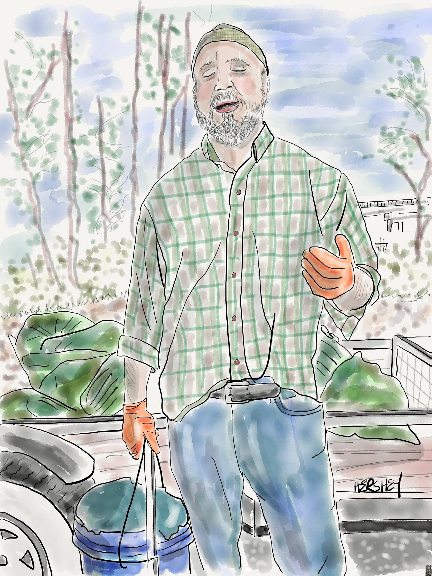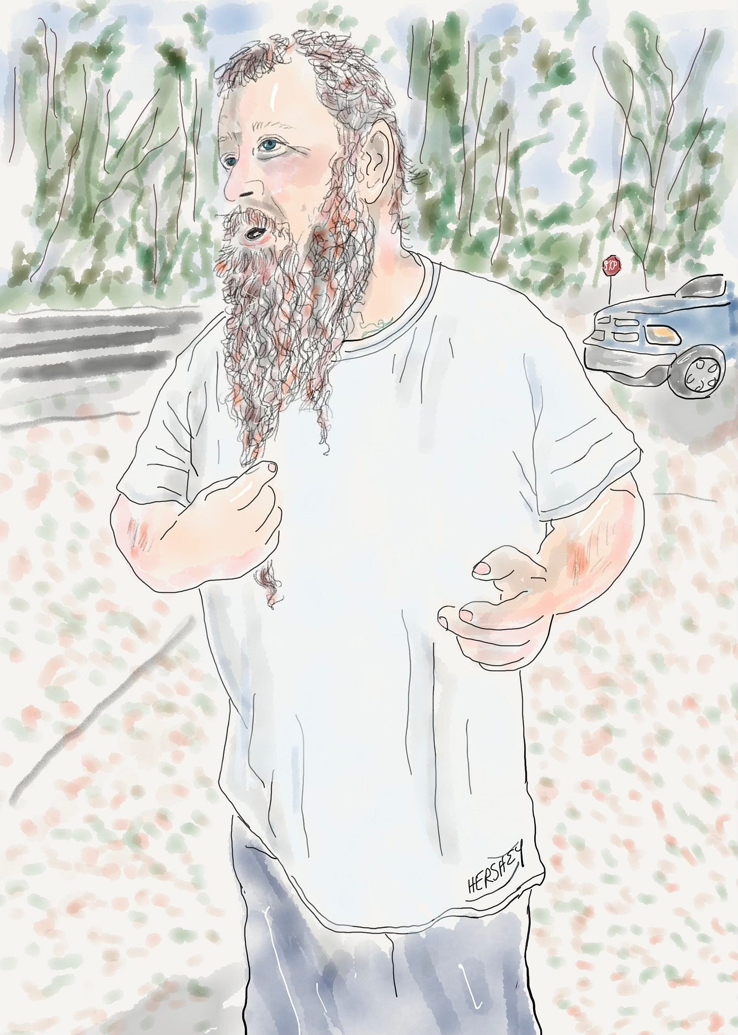 We met Louis outside Ellisville, Mississippi, as we adjusted our gear at an abandoned gas station. Louis was driving by and made a sudden U-turn, pulled into the station, and jumped out of his truck. We didn’t have time to react before he roared, “You got a weapon?” “A weapon?” Jenny replied, “We’re from New York City. We don’t carry weapons. Do we need them here?” Louis shrugged and returned to his pickup, bringing back a box cutter. He handed it to me, and I almost took it, but then I said, “I have a knife in my gear (I did, although it would take me about 10 minutes to find it), so I don’t need that. But thanks!” We fell into chatting, learning that Louis had lived his whole life in Mississippi except for one week in Missouri, and he came back because he was homesick. Jenny admired Louis’s beard. He told us he grew it for his sister-in-law, who makes wigs for kids with cancer. He cuts it for her every three years. “My beard is coarse, so it makes great wigs for black kids. Here, feel it.” Jenny did. Then he touched his head, “My hair up top is softer. It’s for the white kids.” As we finished talking, Louis reached out and hugged Jenny and waved me over to share a group hug (to our complete surprise) before he jumped back in his truck and drove away. Drawing by Jenny Hershey. Follow her on Instagram @deeofo.
