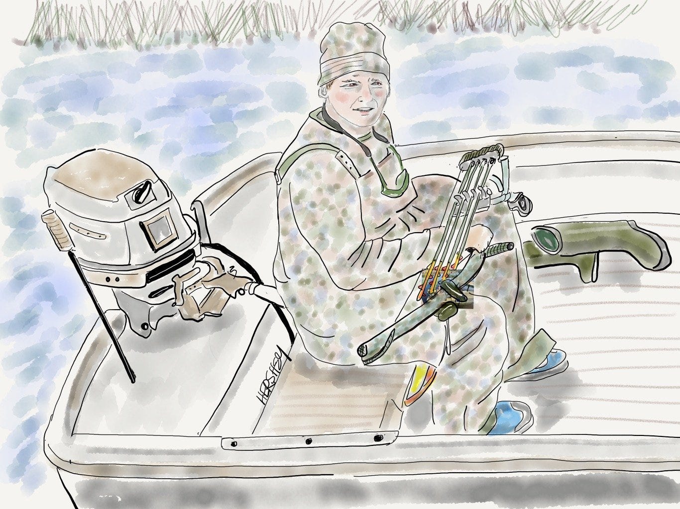 We met Christman at a boat launch in Bayou Cumbest outside Pascagoula, Alabama, near where I took the Pelican photo above. Christman explained how to spell his name like he’d said it hundreds of times - “It’s Christmas with an N, and it’s a family name.” Christman works as a mate on a tugboat in the river, and he is fully dressed in camouflage as he sets out on his boat as the day ends. Having just finished his shift, he hoped to kill a deer or a boar with his bow and arrow, although he said he preferred venison over boar meat. Christman was headed for the closest barrier island, where he would have to bushwhack half a mile through the marshes to find prey. He needed the food because his refrigerator was empty. We had no idea if Christman knew about the elevated cancer rates in this “sacrifice zone neighborhood.” As outsiders, we didn’t think it was our place to ask. Drawing by Jenny Hershey. Follow her on Instagram @deeofo.