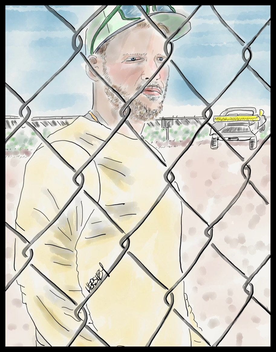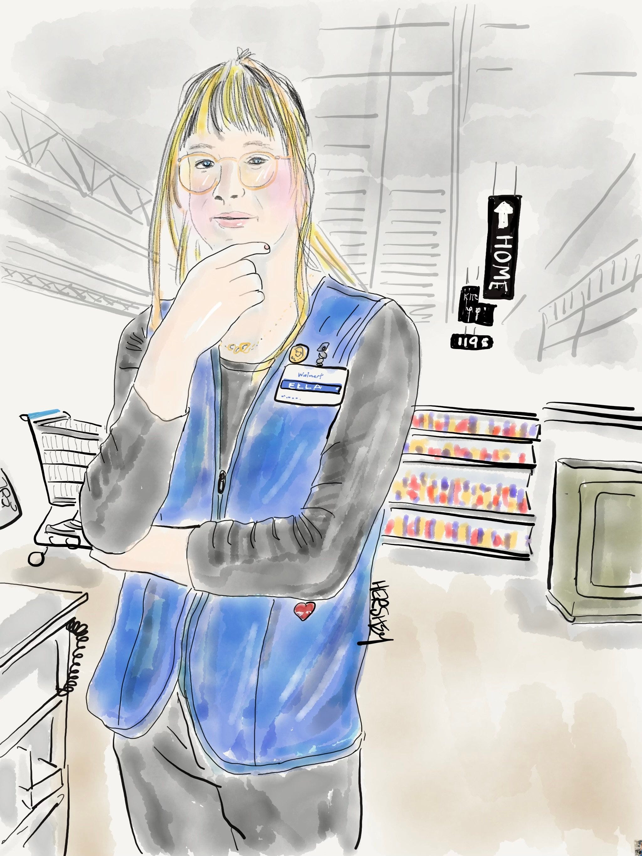 In Chipley, Florida, I went looking for drinking water while Jenny went to the local Walmart to buy food. While checking out, Jenny met Ella, who kindly helped Jenny use the Walmart app. On a hunch, Jenny asked Ella, “So? How’s that governor of yours working out for you?” “He’s not MY governor,” Ella quickly retorted. Now 24, Ella began transitioning from a man to a woman at age 20. She acknowledged that Florida is a difficult state to live in for younger kids in need of hormone treatments. Even so, Jenny learned that Ella’s co-workers are pretty supportive, and Ella has learned how to roll with the punches when customers react uncomfortably to her. She remains calm, “stays in her lane,” and doesn’t react. Ella isn’t a marcher or an activist for transgender rights; it’s enough for her to do what she can to live a good life and enjoy herself - particularly her life with her girlfriend. Drawing by Jenny Hershey. Follow her on Instagram @ deeofo.