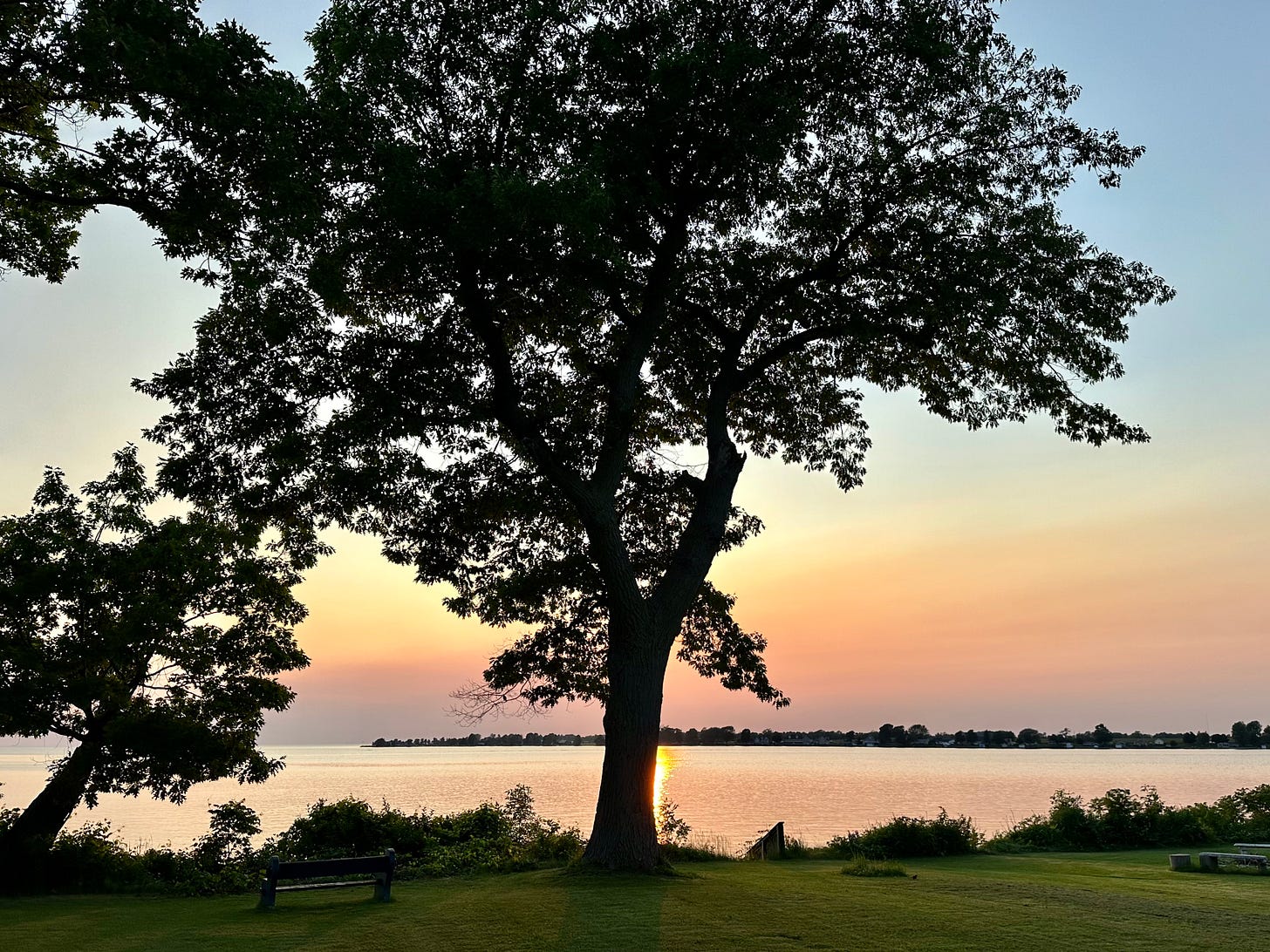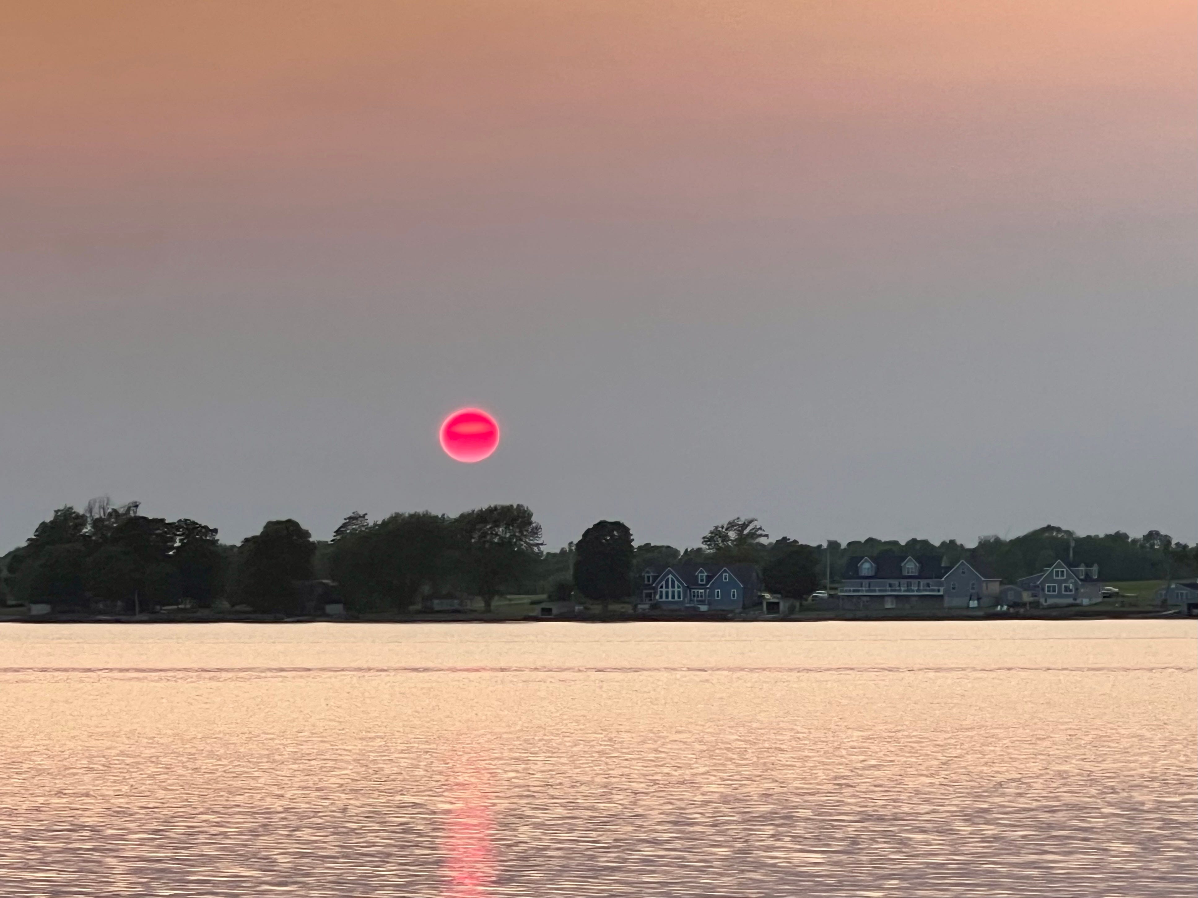 The sun sets over a bay in Lake Ontario in the middle of June south of Cape Vincent, New York, where the headwaters of the St. Lawrence River begin. The sky seemed clear the day we were there, but this picture indicates there might have been some wildfire smoke in the air. Photo by Jenny Hershey. Follow her on Instagram at deeofo.