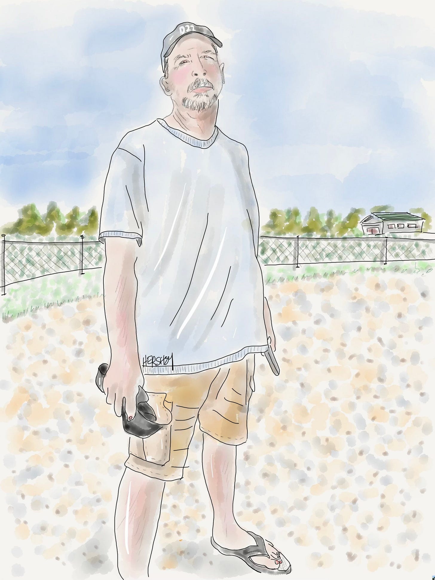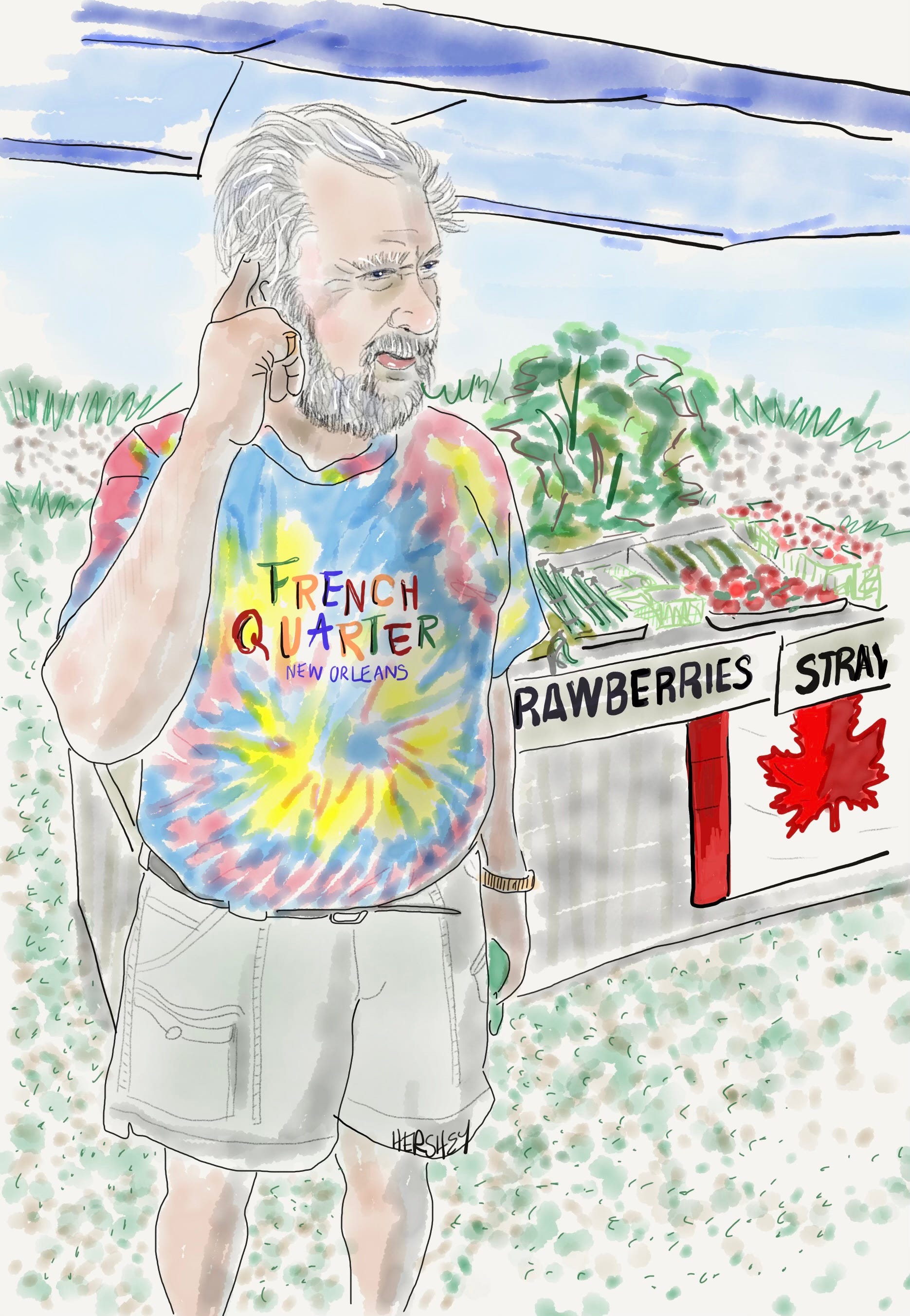 Jenny and I met Dave in Fitzroy Harbor, Ontario. An 80-year-old retired cop from St. Catherine, he was selling organic produce from his garden at a roadside stand. Dave lives alone in a small trailer tending his “Garden of Eden” and described himself as a DP (displaced person). He showed Jenny where a teenager shot off a small chunk of his ear with a buckshot rifle. When we asked him about the wildfires further north, Dave replied without hesitation, “They were set intentionally by the government so they can develop the land up north. It will make them money on property taxes. And it's where they plan on putting all the immigrants.” When we asked him where the immigrants would find jobs if they lived on cleared land up north, he replied, “It’s a socialist country, so they won't work anyway.” He went on, “That's why the government says it's climate change - they blame it on something we can't do anything about, and that's how they get away with it.” Drawing by Jenny Hershey. Follow her work on Instagram at deeofo.