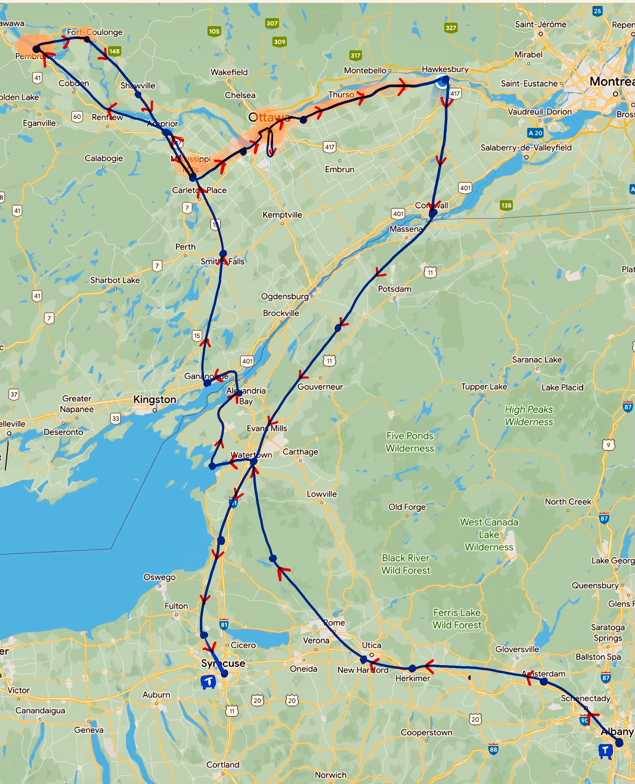 We started our trip in Albany after taking Amtrak from NYC. We couldn't ferry into Canada at Cape Vincent because the ferry captain retired during the pandemic, and no one has replaced him. Consequently, we had to ride northeast 30 miles to the Alexandria Bay crossing and walk several miles on a narrow pedestrian walkway on the American side. We then rode illegally across another bridge into Canada from Wellesley Island (no one told us not to at Canadian customs). From there, Jenny and I headed north toward the Ottawa River, hopscotching between Ontario and Quebec. We encountered the worst air quality from the Canadian wildfires in the orange areas. We ended the trip in Syracuse, where we took a train back to NYC. Altogether we biked about 1000 miles. Map drawing by Jenny Hershey. Follow her work on Instagram at deeofo.