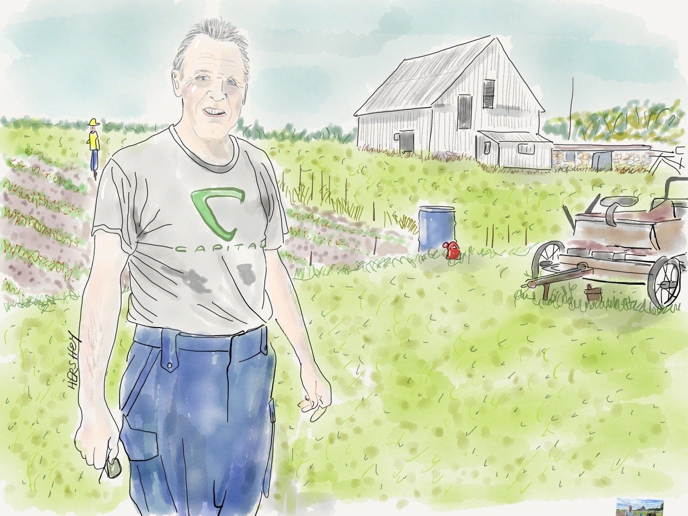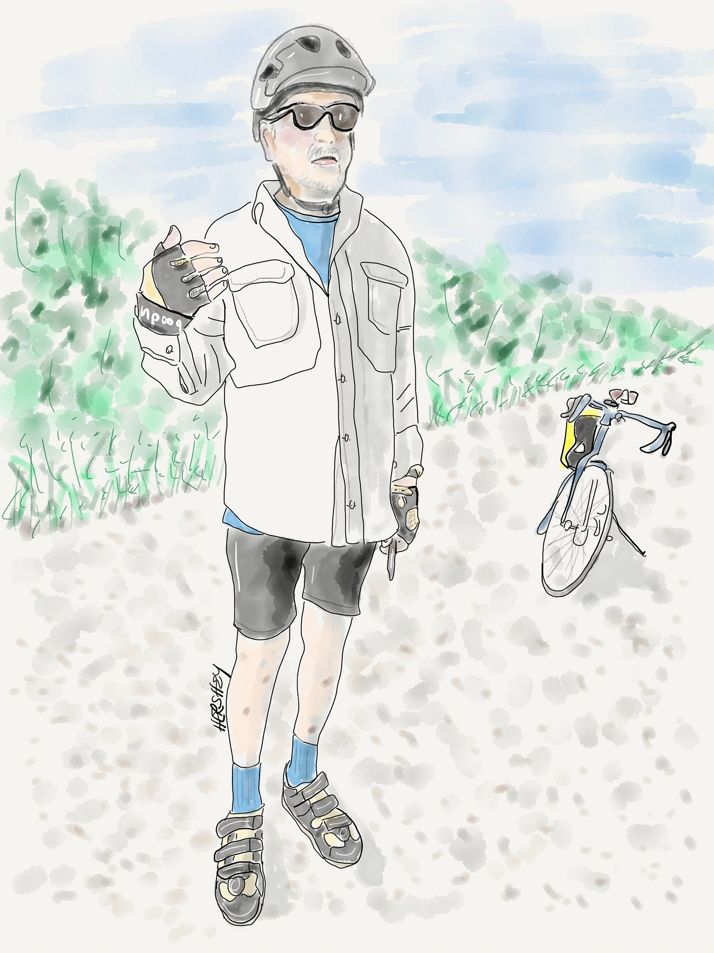 Al is a retired policeman from Ottawa. We met him in Renfrew while he was tending his garden. He was eager to chat and showed us a stone house from 1865 he had purchased from a family that had acquired homesteading land from the Crown seven generations earlier. Al was proud of his antique collection. Eventually, we asked about the wildfires. He believes the fires were most likely started by carelessness and maybe some lightning. He hedged about the climate but eventually agreed with us the climate is changing. A very friendly guy, Al sent us off with a classic milk bottle and a horseshoe for luck (both somewhat challenging to carry on our bikes, but he was insistent). Michael gave the milk bottle away to our host Jeff Mills, and Jenny left the horseshoe at a farm stand with a couple of Mennonite boys, telling them it might bring good luck. Their father quickly corrected Jenny, saying Mennonites don't believe in luck. But the boys kept the horseshoe anyway. Drawing by Jenny Hershey. Follow her on Instagram at deeofo.