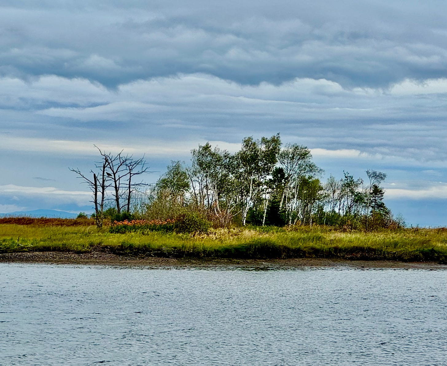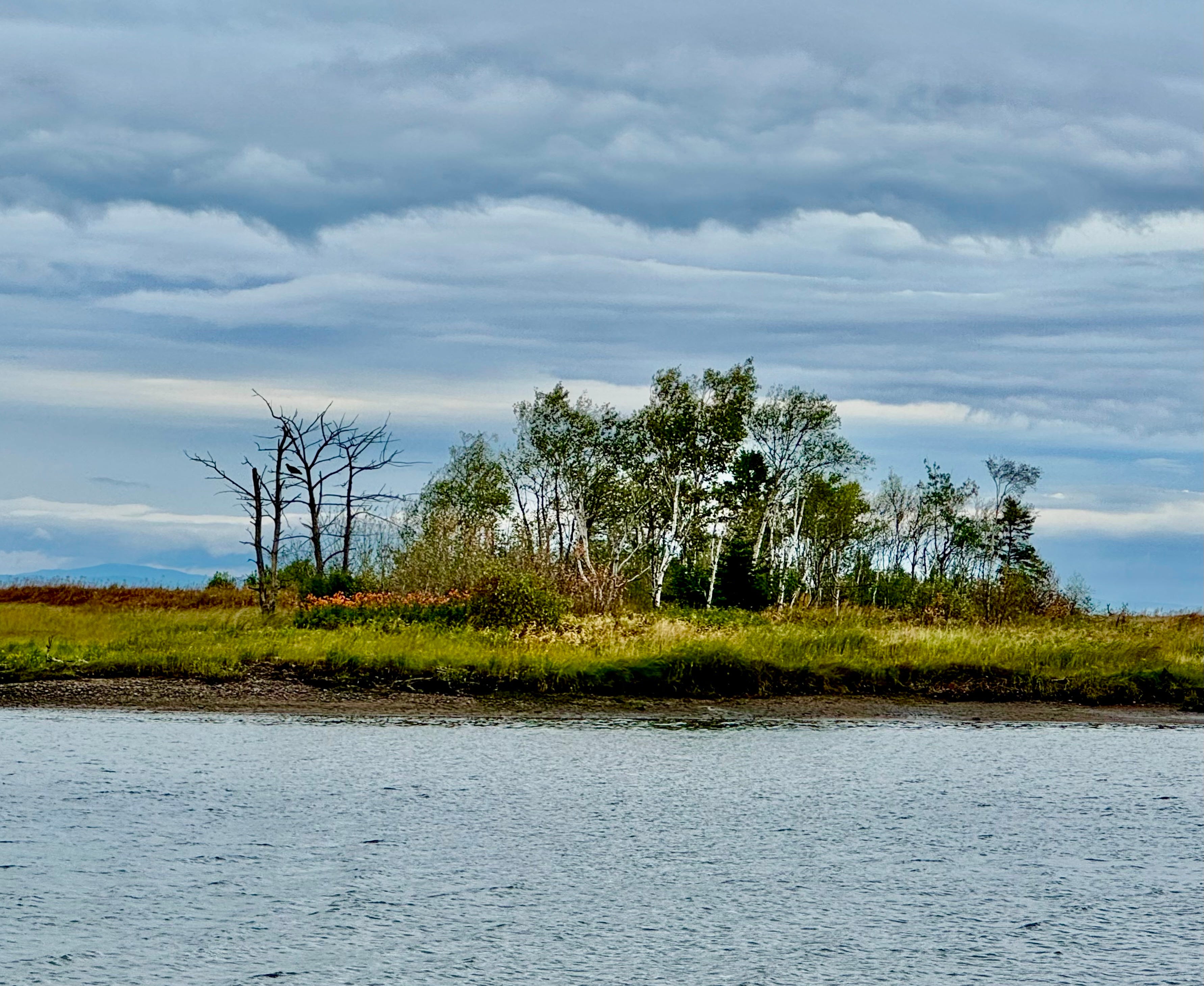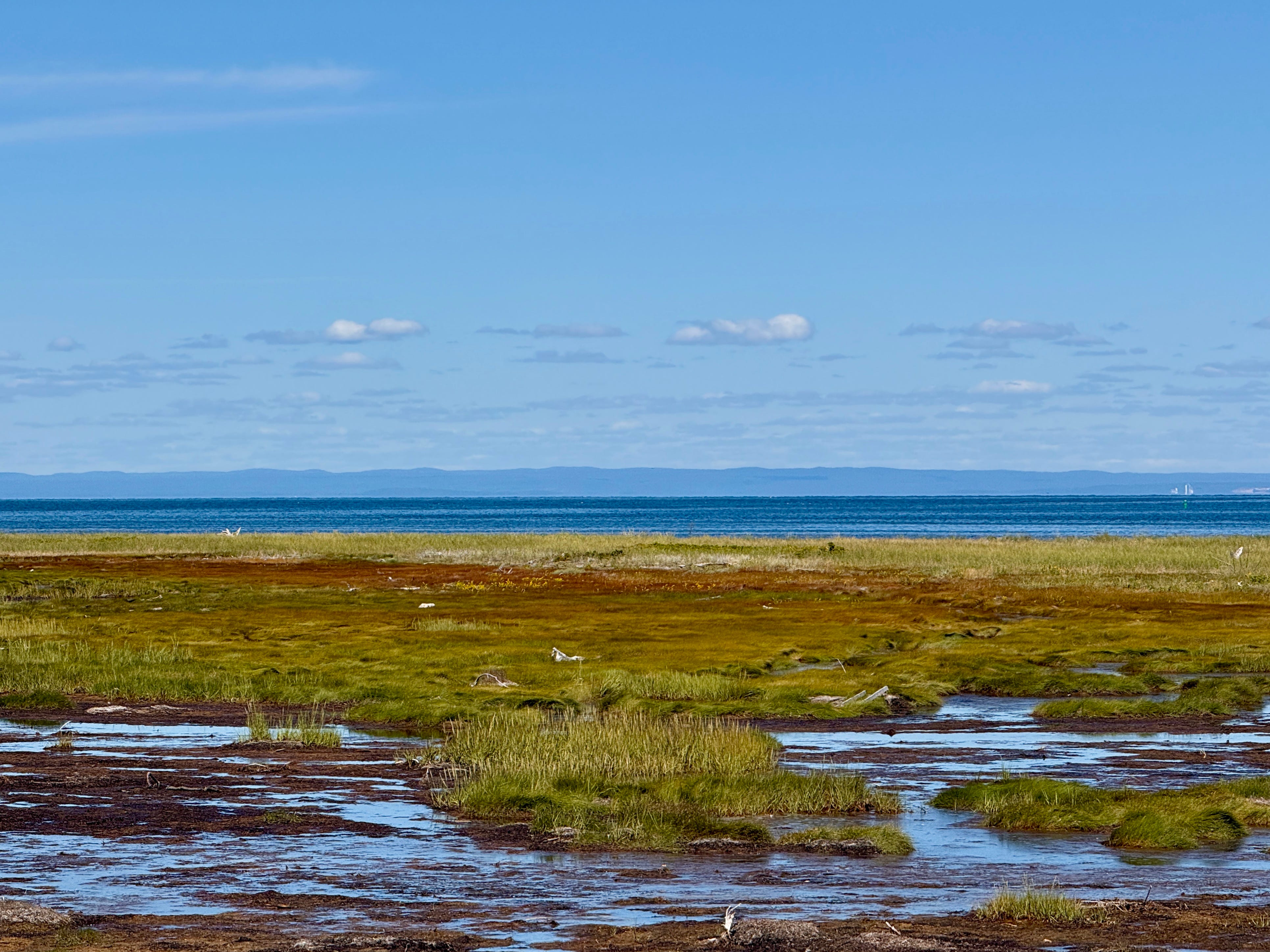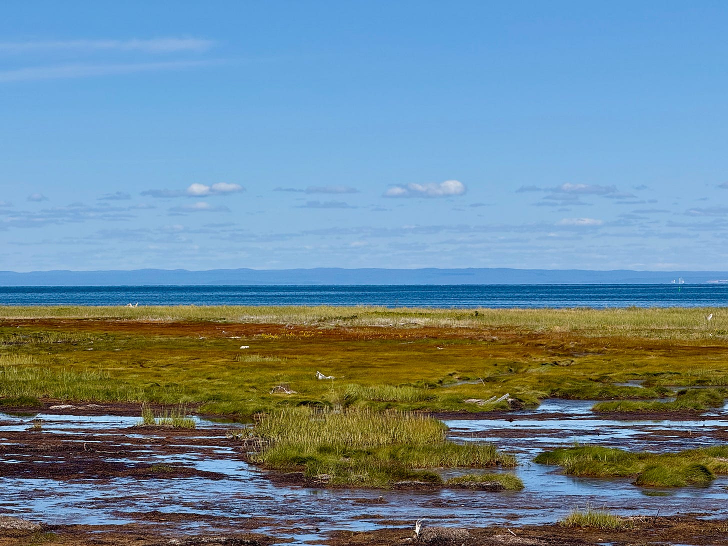 On the southern shore of the Gaspé Peninsula, where the Matapédia River flows into the Restigouche, we found this stunning view. The Restigouche River carves out much of the border between Quebec and New Brunswick. Despite our GPS reading a scorching 107°F in the sun, the sheer beauty of the two rivers captured our attention.