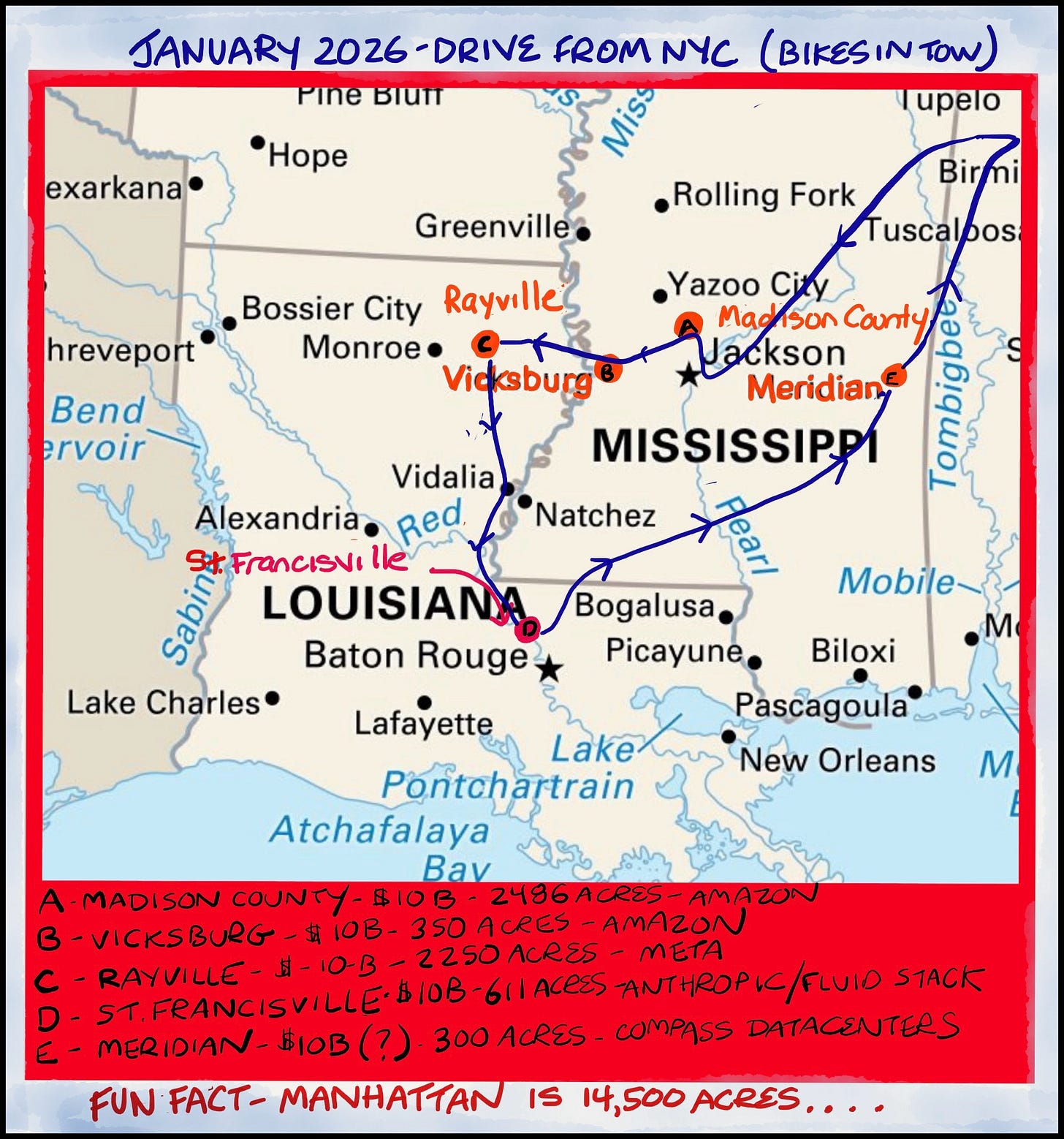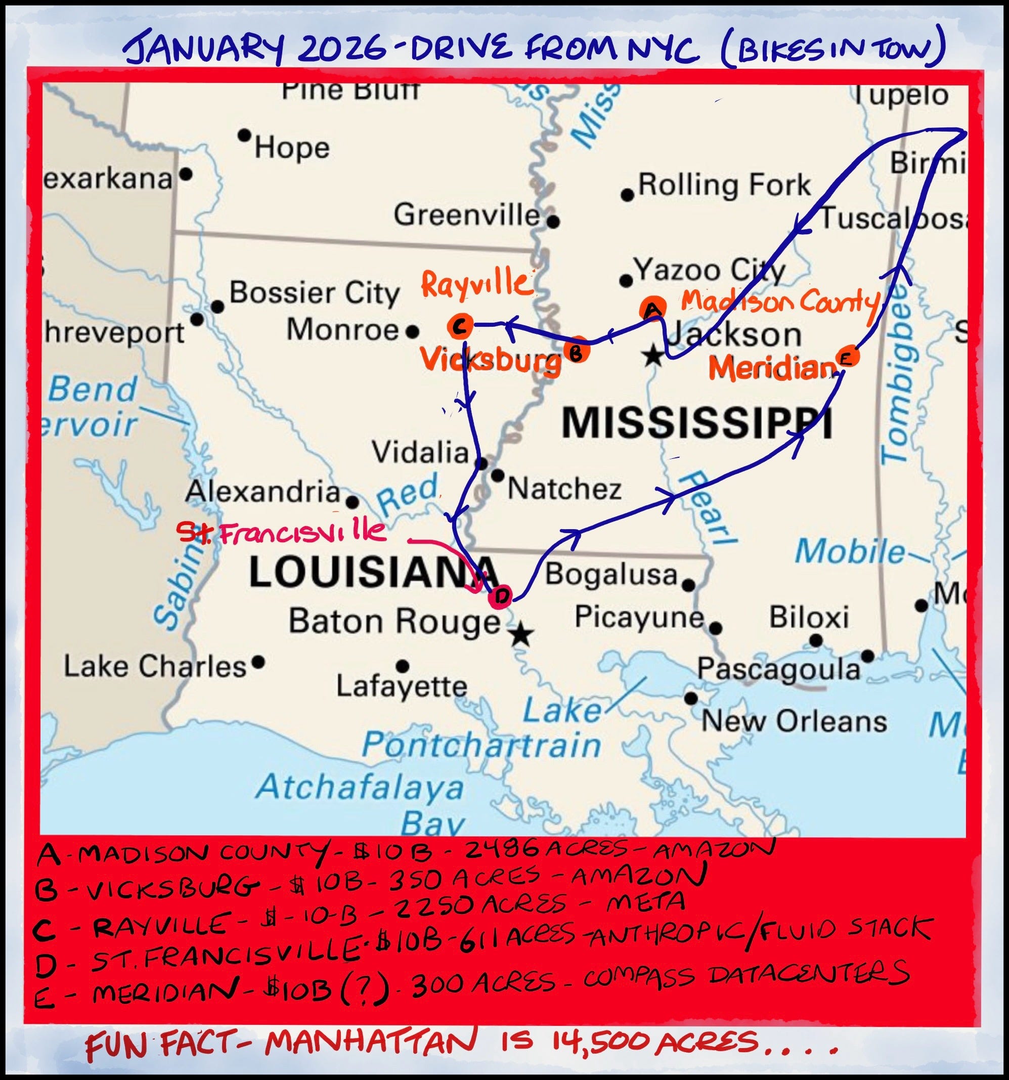 The blue line shows the route we drove by car. We spent many days biking in and around Jackson and Vicksburg, Mississippi, and St. Francisville, Louisiana. The red dots mark the data center sites we visited. All of them are either in the planning phase or in early construction, and none yet have buildings on site.