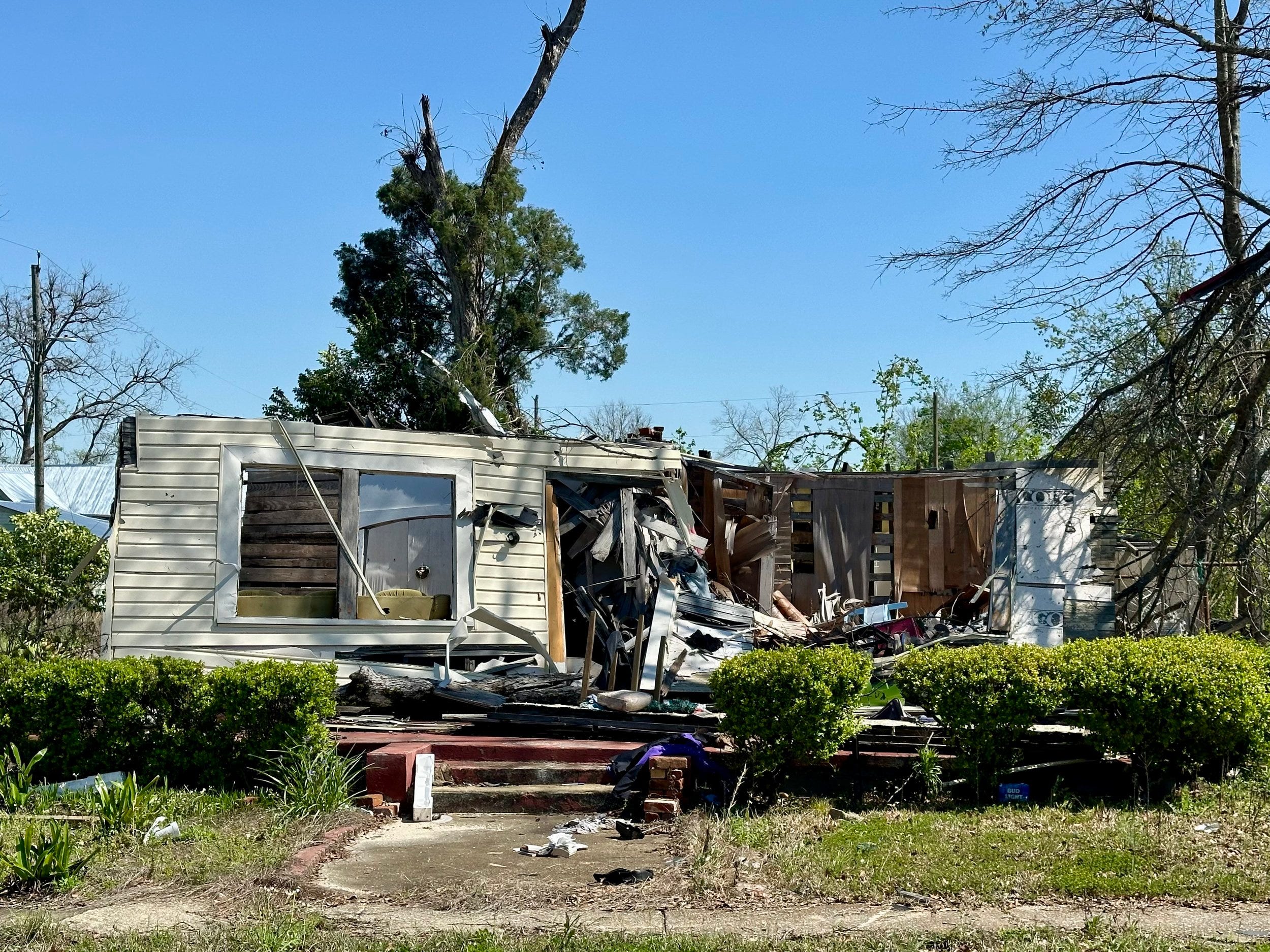 A home demolished by the 2023 tornado in Selma, Alabama, sits empty. We saw many more houses nearby in a similar state of disarray because of the tornado. Home of the famous Selma to Montgomery civil rights marches that began at the historic Edmund Pettus Bridge, Selma remains one of Alabama's poorest cities.