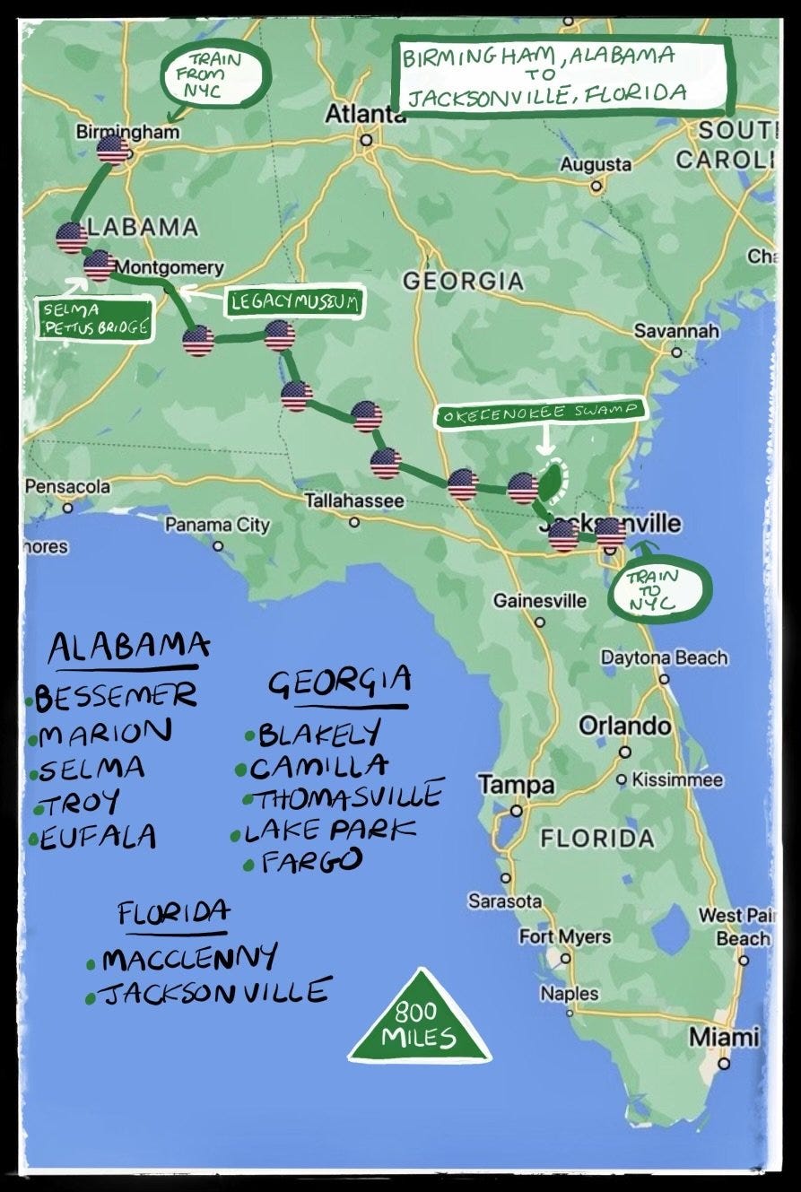 We biked from Birmingham to Jacksonville on this trip. Although we enjoyed all of it, the highlights were the Edmund Pettus Bridge in Selma, the Legacy Museum in Montgomery, and the Okefenokee Swamp Park in southeast Georgia.