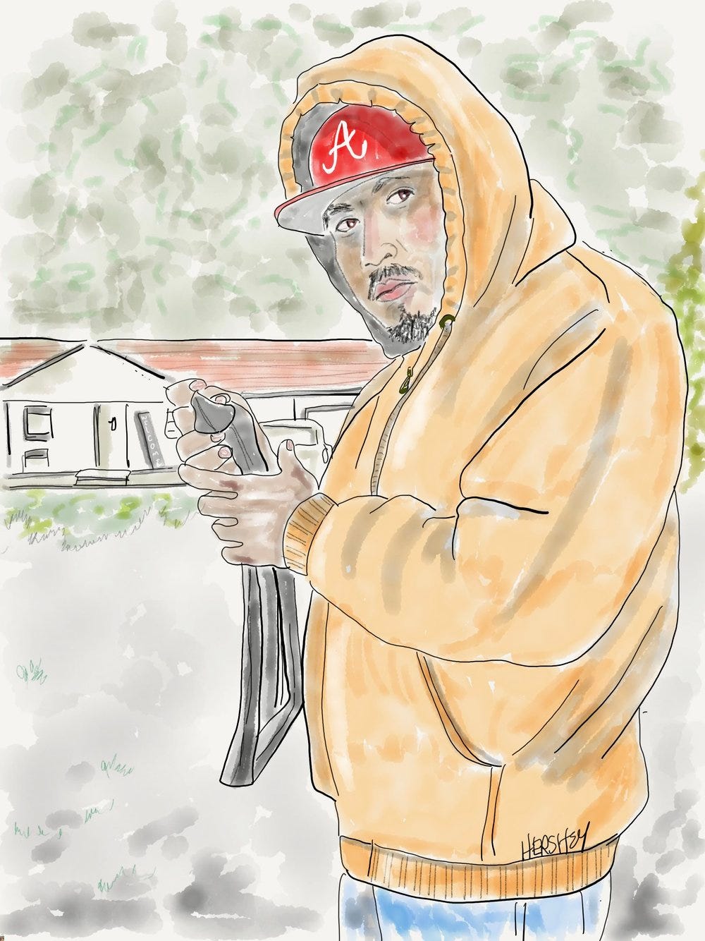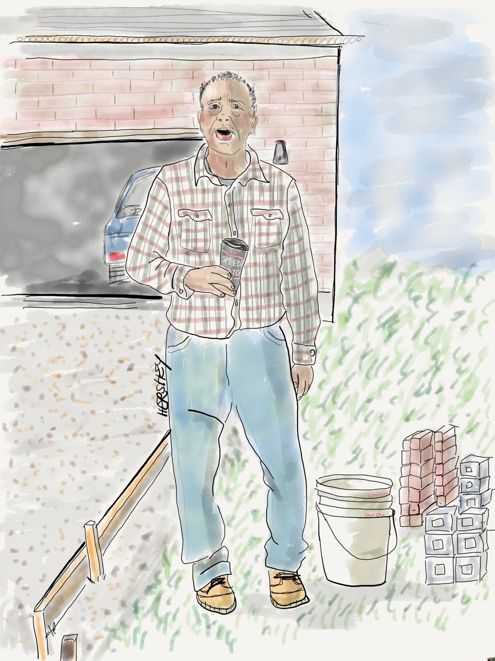 We met Hirty Hopper, a lifelong resident of Mayflower, in the Northwoods subdivision. Hirty is a mason and has been involved in masonry work on many homes following the oil spill. He trusted that the pipeline had been repaired, even telling us the entire pipeline had been rebuilt (it hasn’t). Hirty’s greater concern was seeing the construction completed on a railroad overpass nearby. He explained that the subdivision was only remotely accessible to the nearest hospital. It was located near a railroad track with so few crossings that ambulances couldn’t access the subdivision quickly enough, causing deaths because the wait was so long. “Six people passed,” he told us. Drawing by Jenny Hershey. Follow her on Instagram @deeofo.