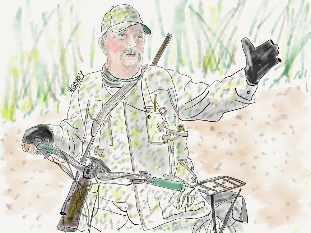On our way up Magazine Mountain in Arkansas, we met Joey on his souped-up e-bike on a gravel backroad. Joey was born and raised (and still lives) in the Arkansas Valley near Paris, Arkansas. Retired from a job with Bridgestone Tire, Joey enjoys hunting for wild turkeys on his bike. He said that his truck scares the turkeys, and he can sneak up on them on a bike. Turkey season in Arkansas is short; it lasts from April 17th - May 7th. An old back injury haunts Joey, but he pushes through, and at the end of the day, he goes home to a loving wife. Two grown children who don’t live very far away not far away give him much joy. A jovial, soft-spoken man with a gun dressed in camouflage riding an e-bike on a gravel road in the woods; can’t find that in Times Square…Drawing by Jenny Hershey. Follow her on Instagram @deeofo.