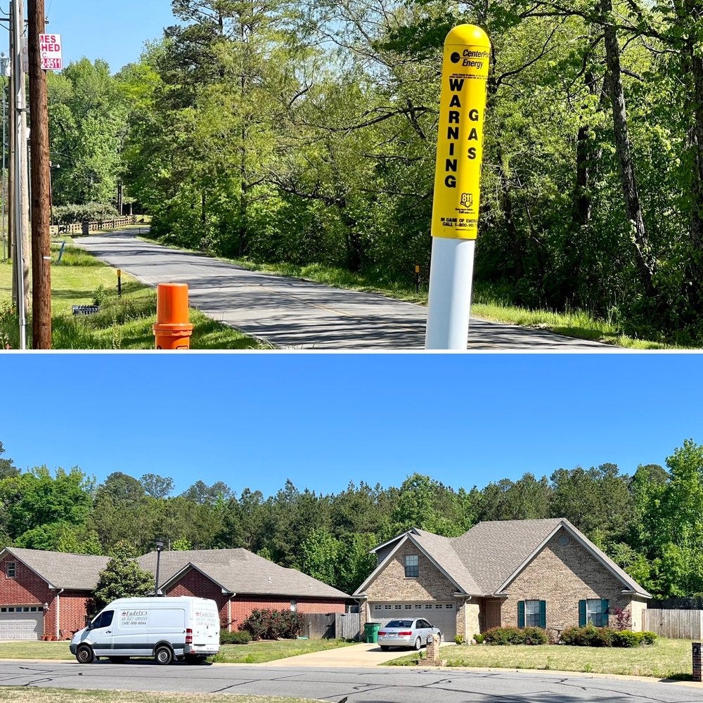 The gas pipeline marker sits next to the main road leading into the Northwoods subdivision of Mayflower, Arkansas. About 100 feet later, a road turns to the right and ends in a cul-de-sac partially visible to the right. These houses are the first things one sees. To our eye, all the houses on this street and many of the houses behind it are new and make up the bulk of the homes that were rebuilt as part of the settlement with ExxonMobil. Despite confidentiality agreements, several plaintiffs said that compensation for medical distress ranged from $2,000 to $15,000, depending on the proximity of the residents to the oil spill.