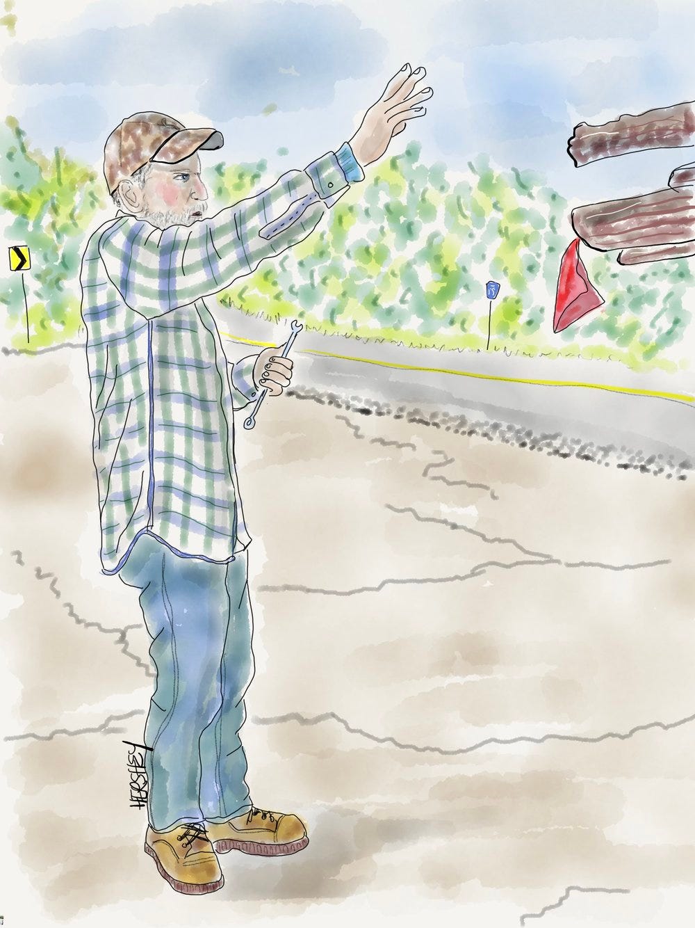 Gary is a 62-year-old log hauler from Clarksville, Arkansas. We met him on Petite Jean Mountain in the Ouachita Mountain west of Little Rock (pronounced like Wichita, except it is Watch-i-ta). Gary was adjusting his brakes under a truck carrying a large load of timber. Gary has been hauling logs for almost 30 years. Still, when Hurricane Harvey hit Houston, he and his wife headed west to help communities by hauling away debris and offering emotional family support. Gary loves to hunt wild turkeys. When we asked Gary about his age, he laughed and told us he was like an overworked mule, “rode hard and put up wet.” He sincerely asked us, “How could we stand living in a city as big as New York?” Jenny launched into her appreciation for the diversity of her neighborhood in New York, and that’s when he told us how much he enjoyed helping diverse folks in Houston after Hurricane Harvey hit. As different as our lives are, we enjoyed learning about our shared values. Drawing by Jenny Hershey. Find her on Instagram @deepfo.