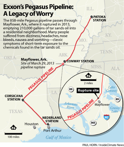 Mayflower, Arkansas, is a small suburban development nestled between North Little Rock and Conway. You might remember the Pegasus Pipeline oil spill in 2013. Owned by ExxonMobil, and used to carry Canadian tar sands oil to the Gulf Coast, it ruptured and dumped approximately 10,000 gallons of tar sands oil into the Mayflower Northwoods subdivision.
