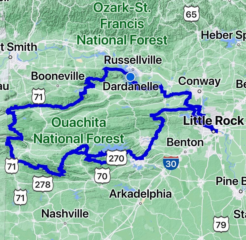 Jenny and I planned our bicycling trip through the Ouachita Mountains in the Ozark High Country, following a route that took us from Conway to Little Rock. From there, we will take an Amtrak train to visit family in Milwaukee and then another train back home from Chicago to New York City. We used a map provided by the American Cycling Association to guide us on our journey.