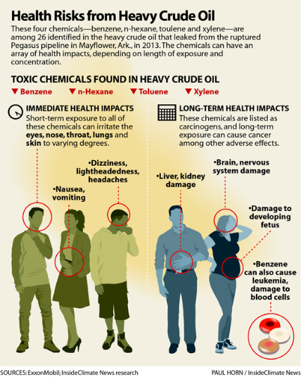 Back in the Northwoods subdivision, a few hundred people were sickened by an odor that was almost thick enough to feel; the spilled oil was bitumen mixed with diluted hydrocarbons. Residents complained about headaches, diarrhea, swollen eyes, dry heaves, and burning lungs. But the full extent of the medical consequences didn’t come to light until 2017 when 708 pages of documents were finally released by the federal pipeline safety regulator known as the Pipeline and Hazardous Materials Safety Administration (PHMSA) after a protracted court battle where PHMSA and ExxonMobil squared off with a nonprofit watchdog group, the Pipeline Safety Trust.